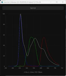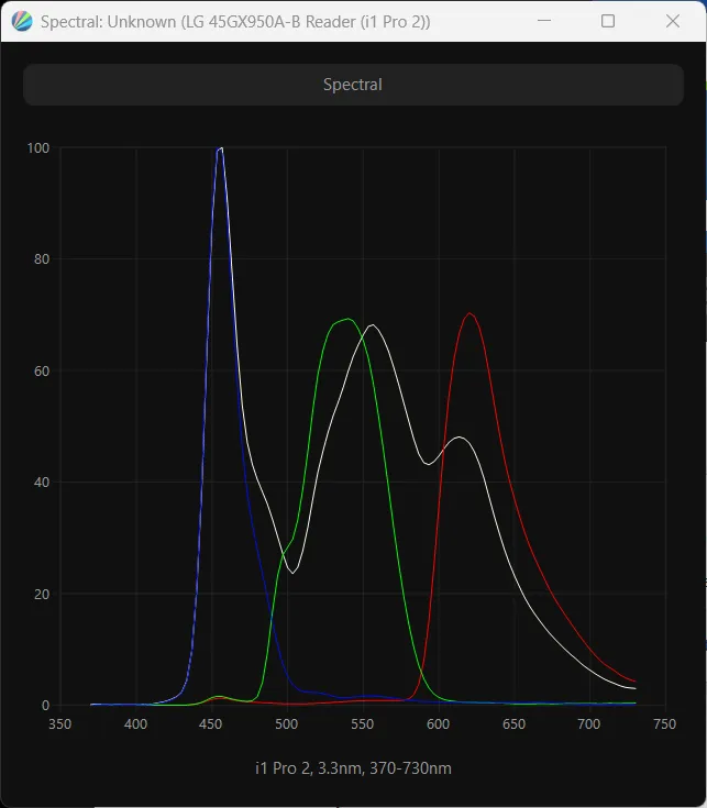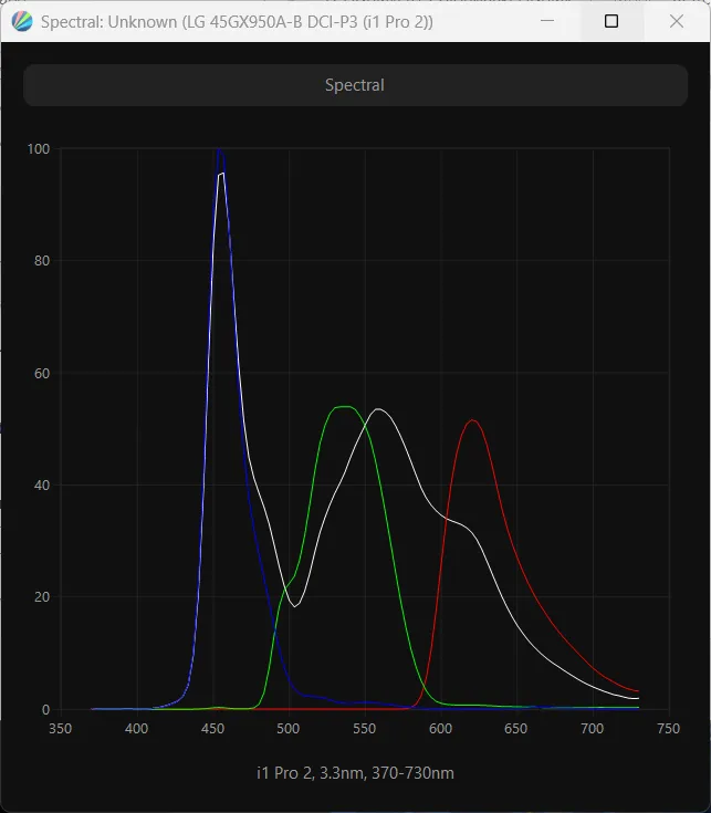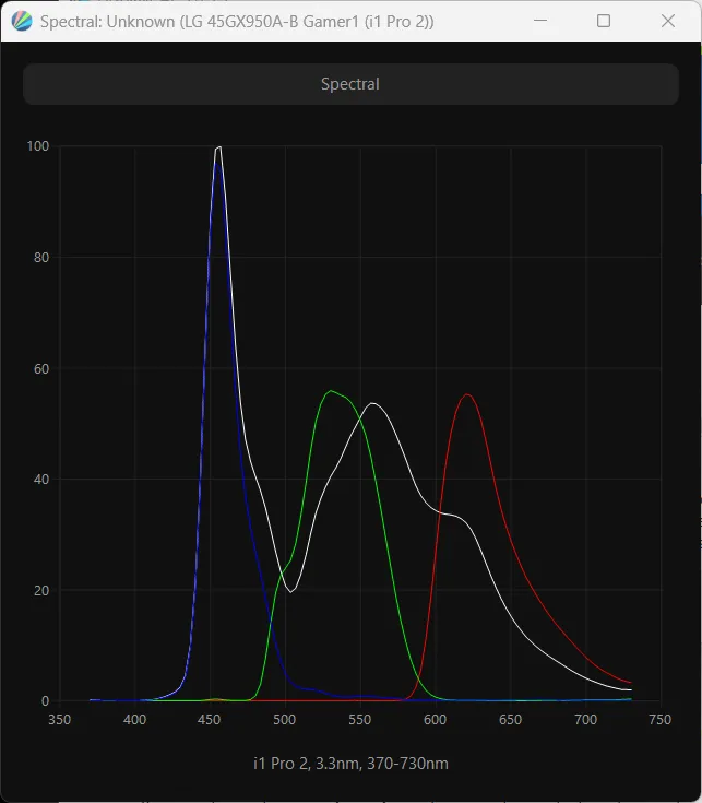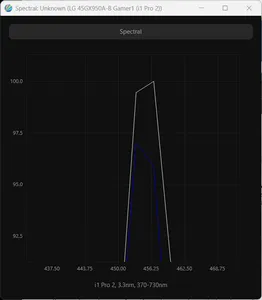 Монитор использует новую 44,5-дюймовую W-OLED матрицу LG Display с расширенным цветовым охватом, близким по заявлению производителя к полному DCI-P3 (98,5%). Проверим возможности панели на случайном экземпляре 45GX950A-B: