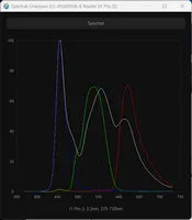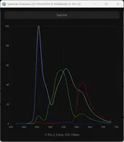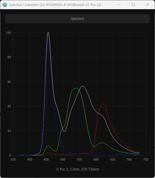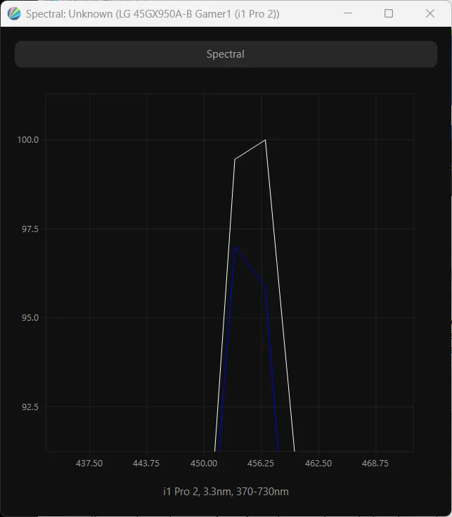 Рабочий спектр W-OLED панели изначально несколько напоминает LCD матрицы с самой простой W-LED подсветкой, но по факту это, конечно же, не так. Пик синего здесь приходится на область 454-456 нм, что близко к уровню давно выпущенных на рынок Nano-IPS матриц от LG Display. Впрочем, нельзя сказать, что подобный сдвиг является очень значимым для снижения усталости глаз, хотя монитор и получил сертификат безопасности EyeSafe Certified 2.0 и вероятно ещё какой-нибудь от TUV.
