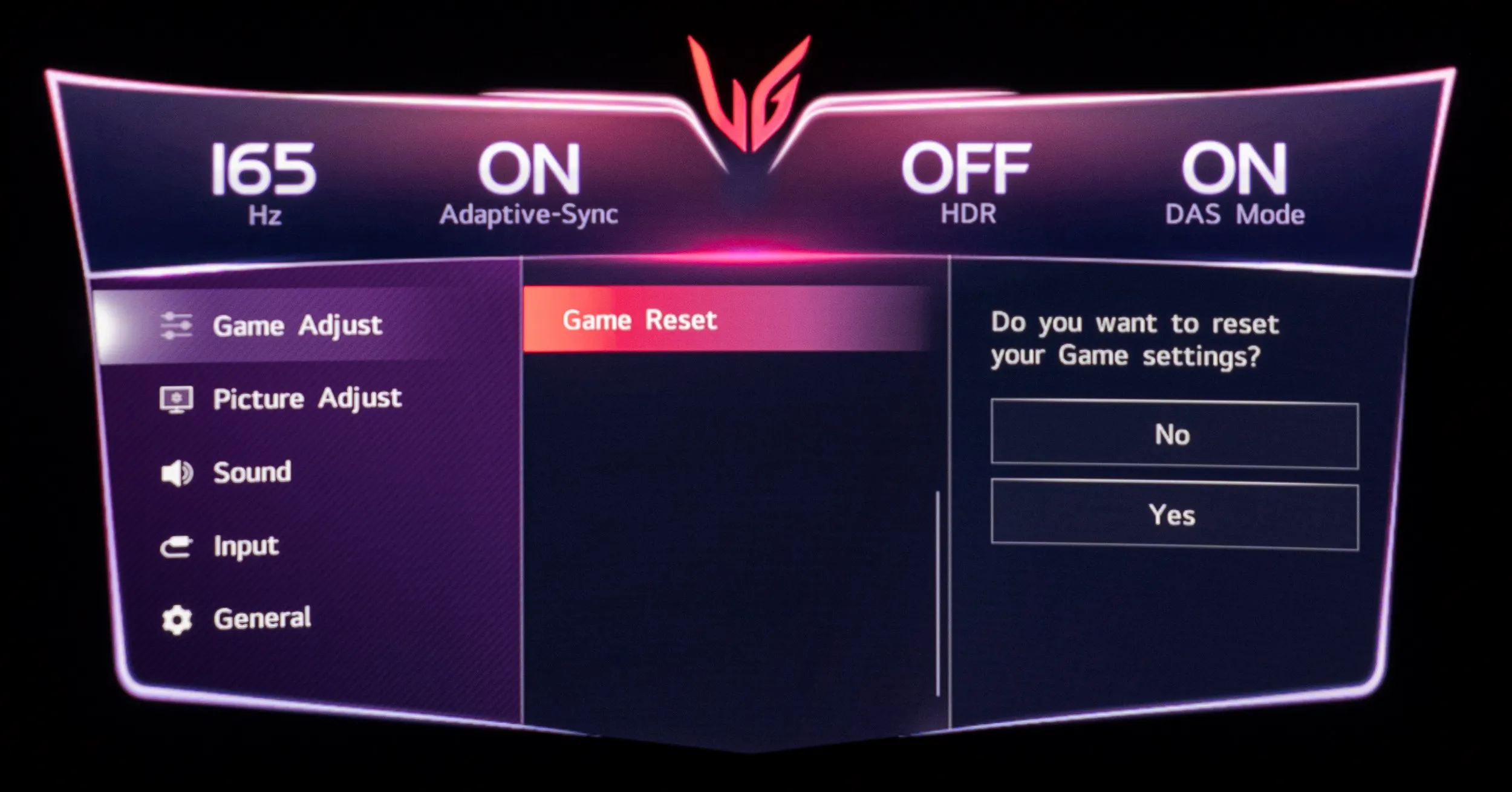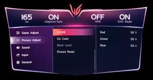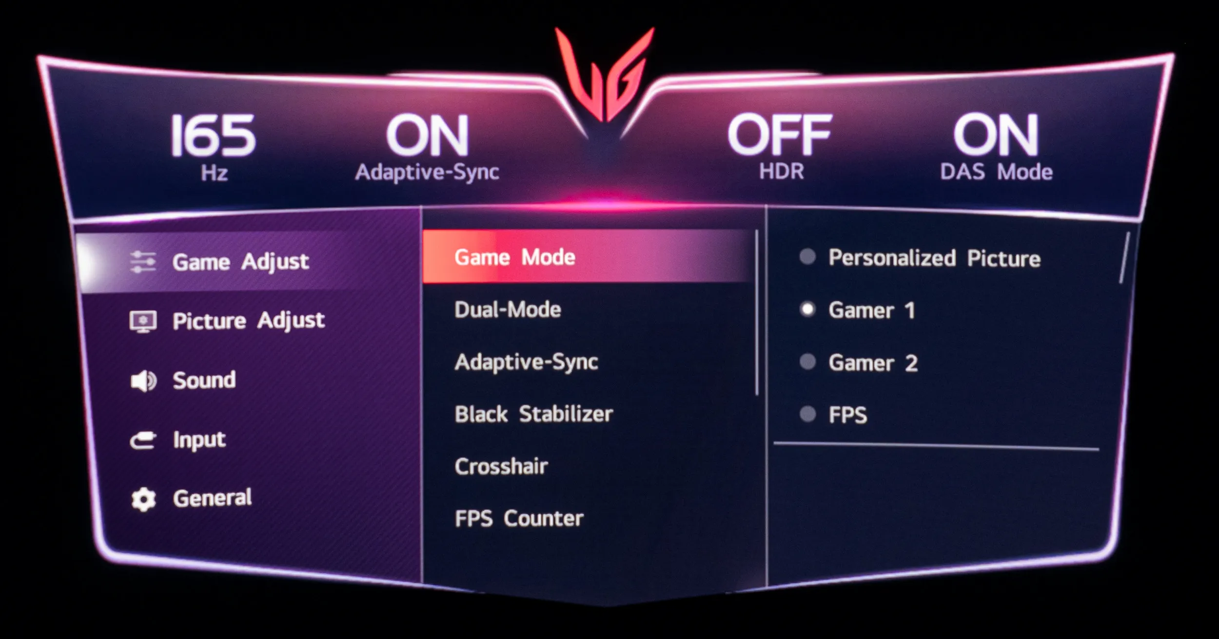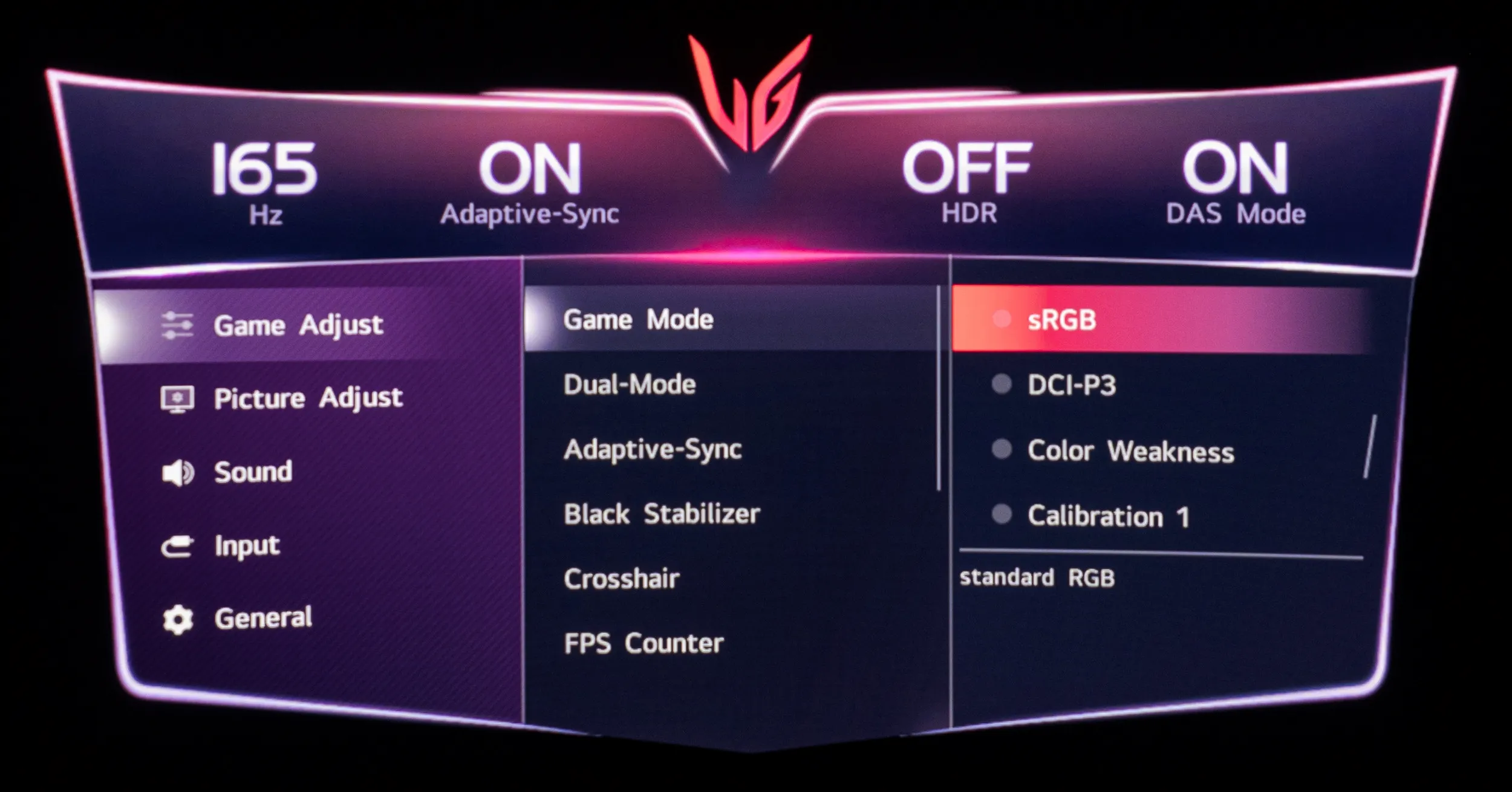 На этот раз мы решили изучить меню, представленное на английском языке. В первом разделе Game Adjust предлагается выбрать предустановленный режим, многие из которых отнесены к «игровым». Дополнительно представлена пара режимов эмуляции различных цветовых пространств, есть два профиля для использования внутреннего LUT монитора и персонализированный блок для доступа к созданным профилям в специальном ПО от LG (специально для тех, кому будет мало предустановленных).