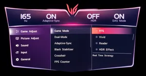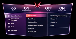Далее можно активировать Adaptive-Sync для поддержки МКК-систем, изменить степень различимости теней (функция Black Stabilizer), включить и настроить прицел, активировать счётчик fps (на самом деле он показывает лишь частоту вертикальной развёртки), а также сбросить настройки к позициям по умолчанию.