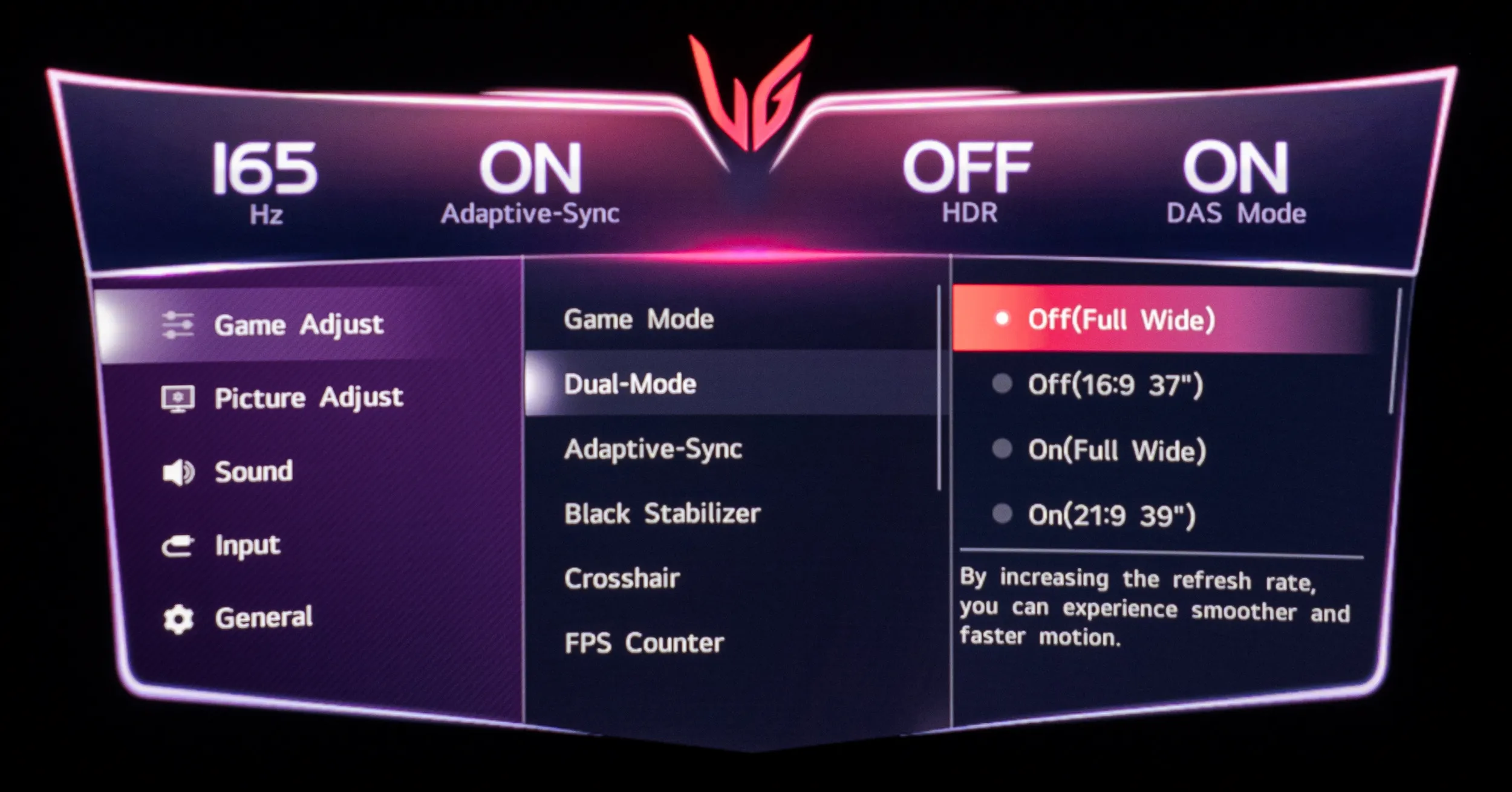 Используя все последние наработки в сфере W-OLED, доступные в массовом производстве, LG достигли пиковой яркостью выше 1300 нит, но с цветовым охватом никаких движений в верном направлении не произошло. Производитель установил адекватный уровень развёртки для нативного разрешения в 165 Гц, но решил удивить 330 Гц благодаря продвигаемому подходу Dual-Mode. Правда, при всём этом, он забыл уточнить что качество картинки будет снижено из-за отработавшей внутренней интерполяции изображения.