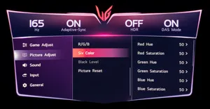 Параметры, напрямую влияющие на качество картинки на экране, выделены в раздел Picture Adjust. Тут, как и всегда, находятся регулировки яркости и контрастности, гаммы, температуры цвета вместе с правками RGB, 6-осевая коррекция, установка рабочего диапазона (Black Level — актуально только для HDMI), включение режима Peak Brightness, регулировка чёткости картинки и очередной пункт сброса значений к заводским.