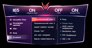 Отметим, что некоторые опции несовместимы с определёнными технологиями, а также не могут быть активированы в определённых режимах изображения, о чём указывают специальные подсказки на OSD экране.