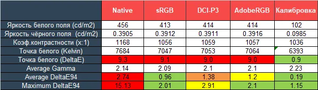 В ходе проведенной калибровки для приведения точки белого до уровня яркости в 100 нит и 6500К были использованы следующие настройки: