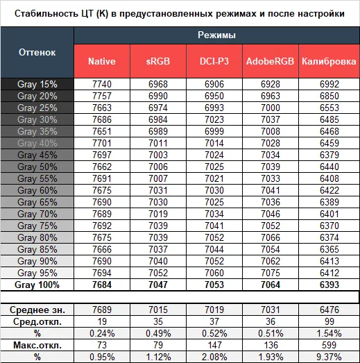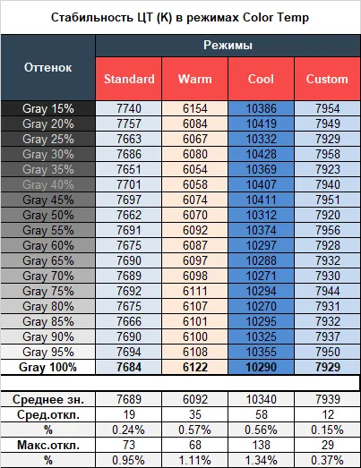 Теперь рассмотрим результаты специальных режимов Color Temperature. Напомним, что по умолчанию производитель установил пресет Standard со значениями RGB 50/50/50. Поэтому стоит учитывать, что значения его столбца полностью совпадают с результатами режима Native из первой таблицы данного подраздела тестирования. Остаётся лишь поговорить про оставшиеся предустановки ЦТ с разными названиями: