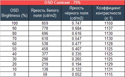 Для изучения стабильности контрастности и диапазона изменения яркости был выставлен режим Native. Значение Brightness менялось с 100 до 0% с шагом в 10 единиц, система управления локальной подсветкой была дезактивирована.
