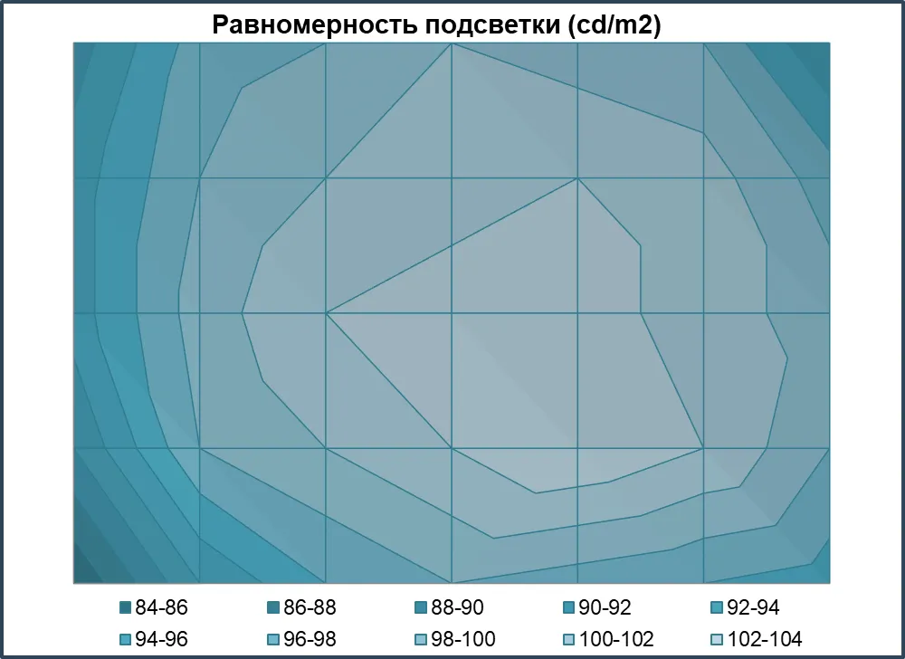 Равномерность подсветки монитора и цветовой температуры по полю экрана проверялась в 35 точках при установленной яркости монитора в 100 нит. За основу всех подсчётов (отклонений) брались данные из центральной точки.