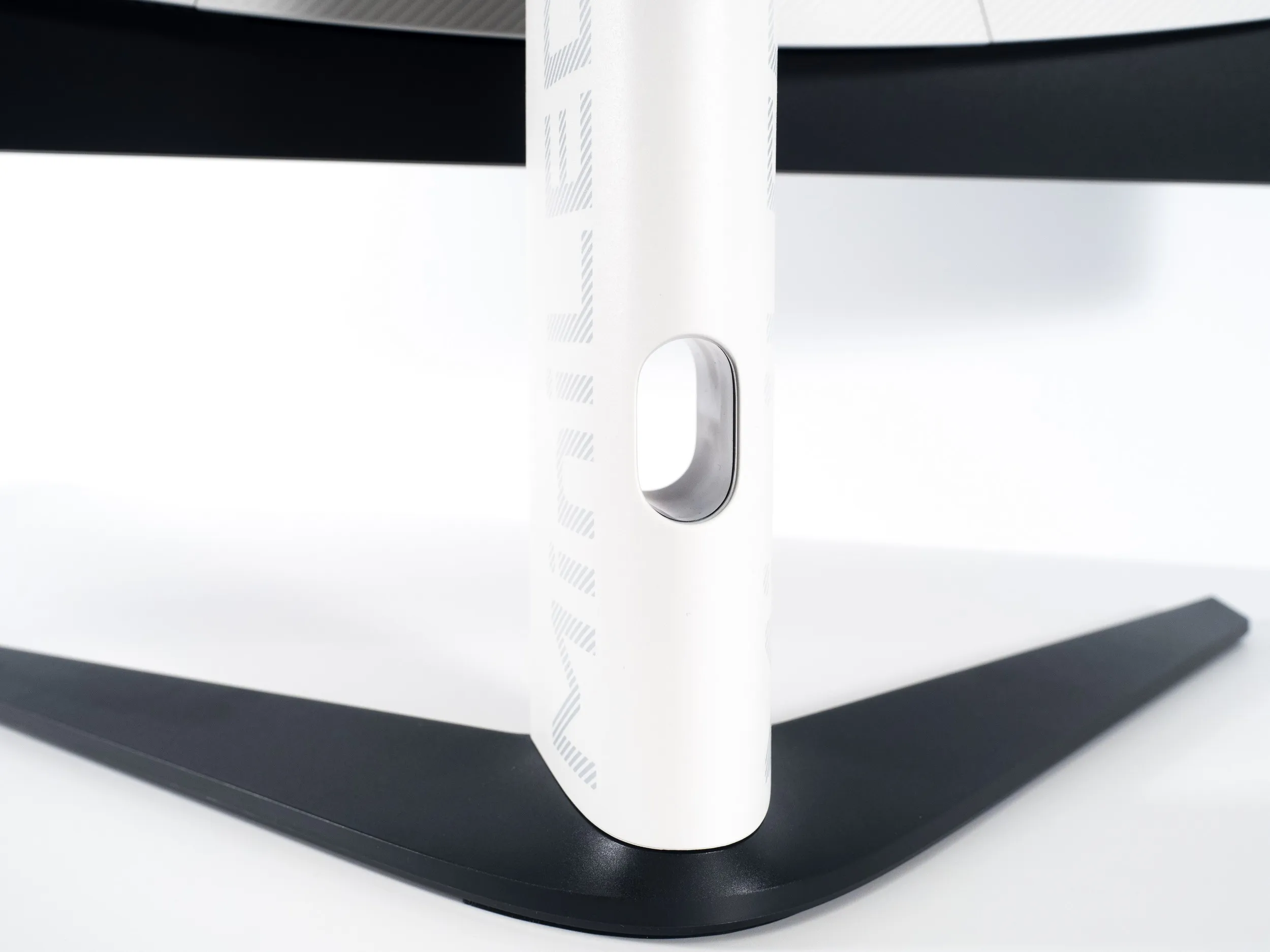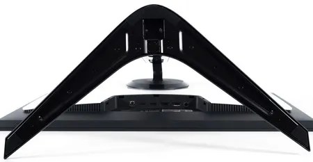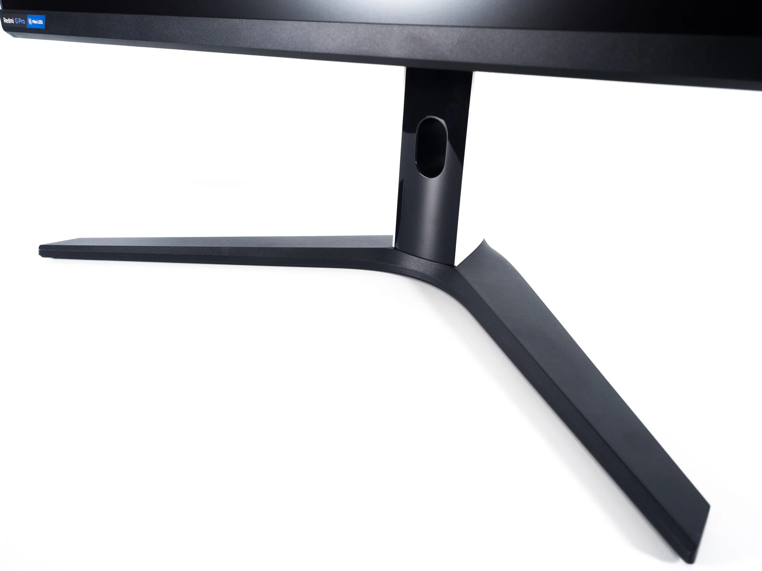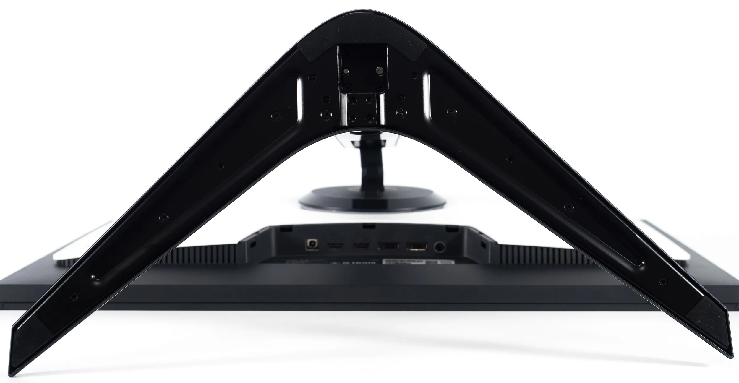В новинке используется Y-подобная подставка. Центральная колонна стыкуется с корпусом монитора буквально за пару секунд. Внешний шарнир выполнен из крашенного в чёрный матовый цвет металла. VESA-совместимое крепление стандарта 75 х 75 мм возвышается в зоне крепежа, а для разъединения необходимо отвести пластиковый рычажок вниз – всё очень просто и понятно.