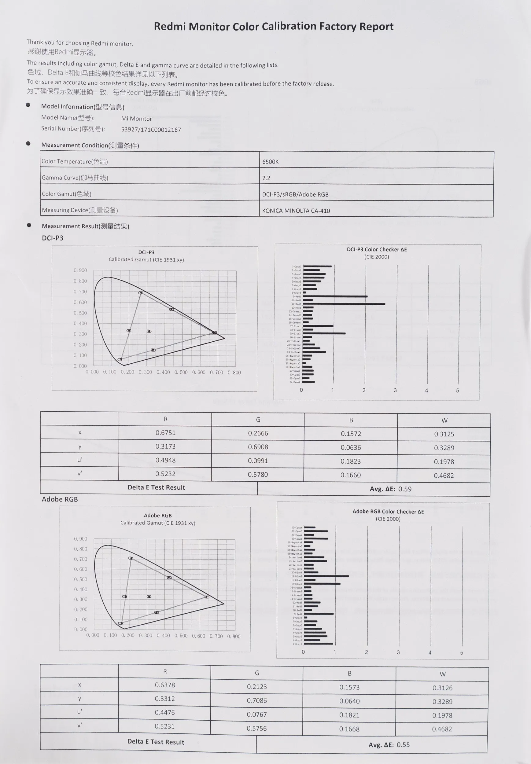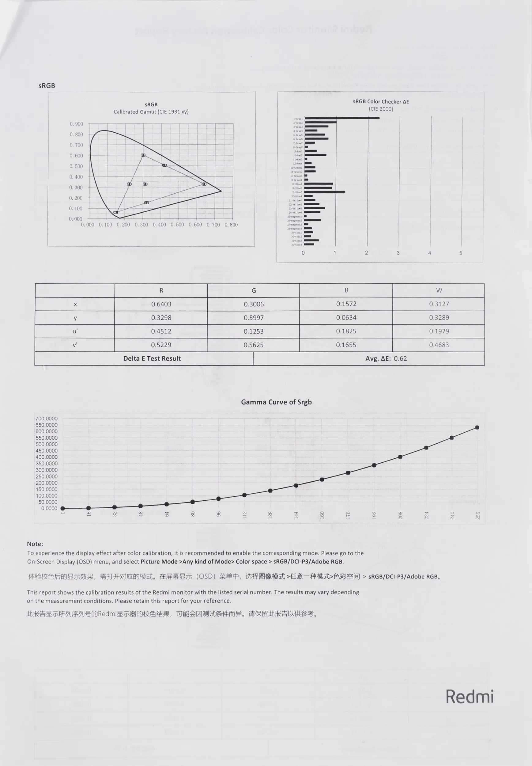 Также в комплекте монитора Xiaomi Redmi Display G Pro присутствует отчёт о заводской калибровке монитора с полноценным набором собранных данных по результатам проверки режимов эмуляции пространств sRGB, AdobeRGB и DCI-P3. В некоторых из них получены отклонения DeltaE с некоторым превышением допустимых границ для качественной настройки, в других же всё на высоком уровне. Каждый режим, по утверждению производителей, настроен по гамме стандарта sRGB с улучшенной различимостью в тенях. Для подобного монитора, если это всё окажется правдой – ещё одна «звёздочка» в копилку модели.