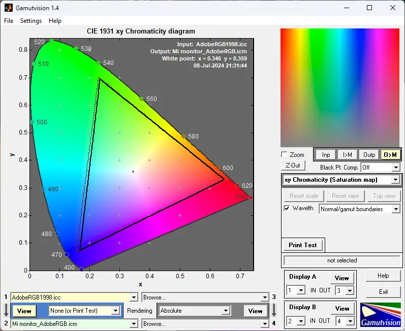 Все значения были получены при профилировании в среде Argyll CMS, с отсечением цветов и оттенков, выходящих за границы референсных значений. При заводских установках (Native – Wide Gamut) монитор смог продемонстрировать соответствие sRGB почти на 100 % с выходом за его пределы на 72 %, а в режиме эмуляции sRGB хоть и потерял высокое соответствие, но зато лишился перенасыщения. В режимах эмуляции DCI-P3 и AdobeRGB соответствие составило 97,7 % и 95,2 % - прекрасные результаты.