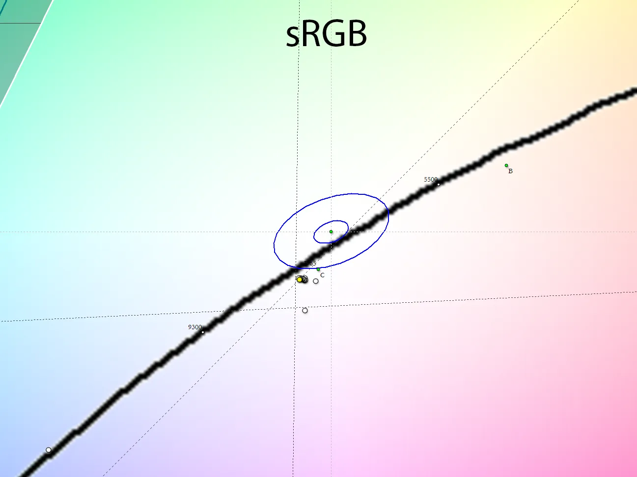 С точки же зрения настройки баланса серого мы можем наблюдать легкий розовый паразитный оттенок и совсем иное расположение точек на CIE-диаграмме в сравнении с заводскими установками в режиме Native. Цветовой баланс слегка смещается.