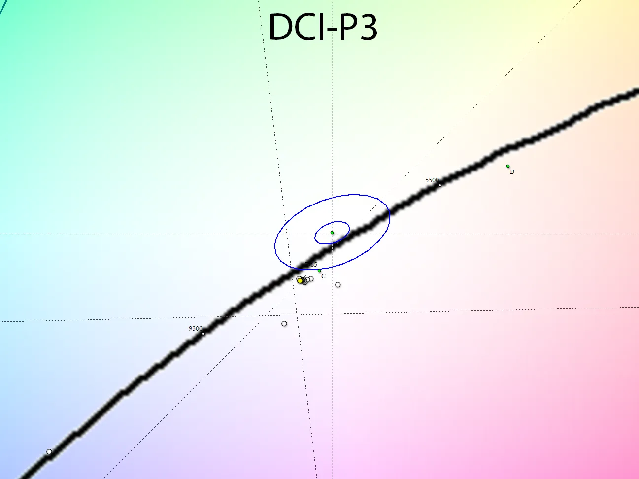 При тестировании использовались ручные настройки ЦТ для получения 6500K, яркость белого поля в центральной точке сохранялась на уровне 100 нит. Среднее отклонение составило 3,4 %, максимальное 8,9 % при разнице между измеренными минимумом и максимумом чуть выше 1000К. Увы, но это низкий результат, ставший одним из основных недостатков исследуемого решения.