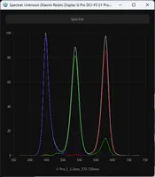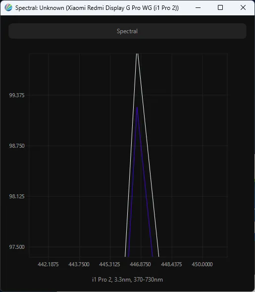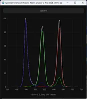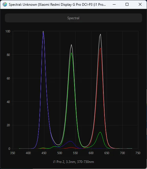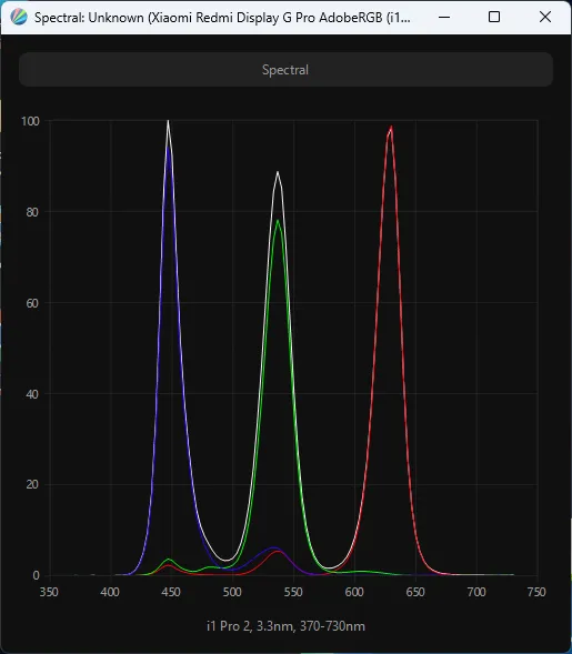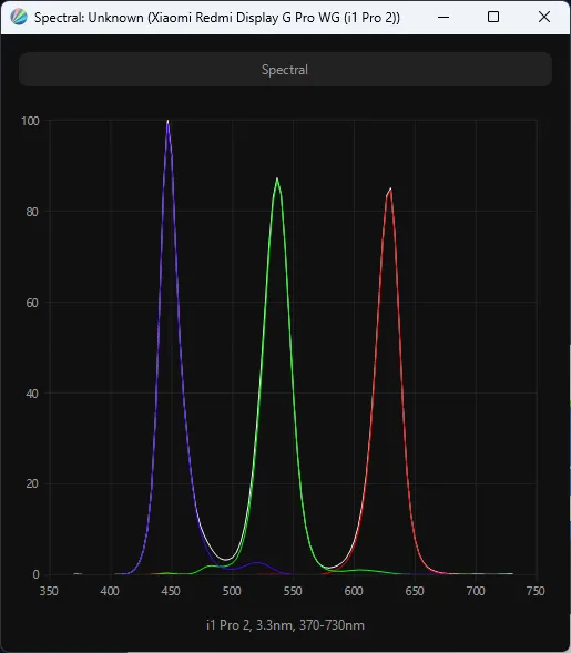 Исходя из полученного спектра подсветки, можно сделать вывод, что в матрице от BOE используется специальное химическое соединение, нанесённое нано-частицами (т.е очень-очень маленькими) на привычные «белые» светодиоды подсветки. Скорее всего речь идёт о неком аналоге «квантовых точек» (Quantum Dots), поскольку пики спектра хорошо уравновешены, а полученные цветовой охват матрицы в ходе нашего тестирования оказался крайне широким.