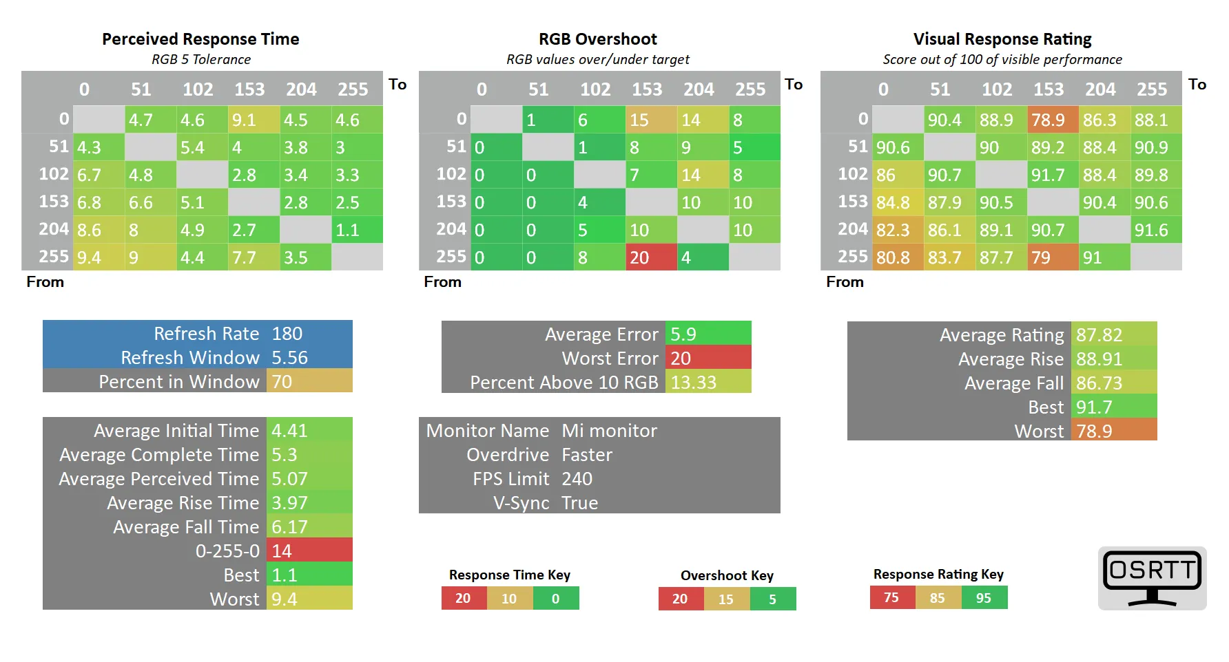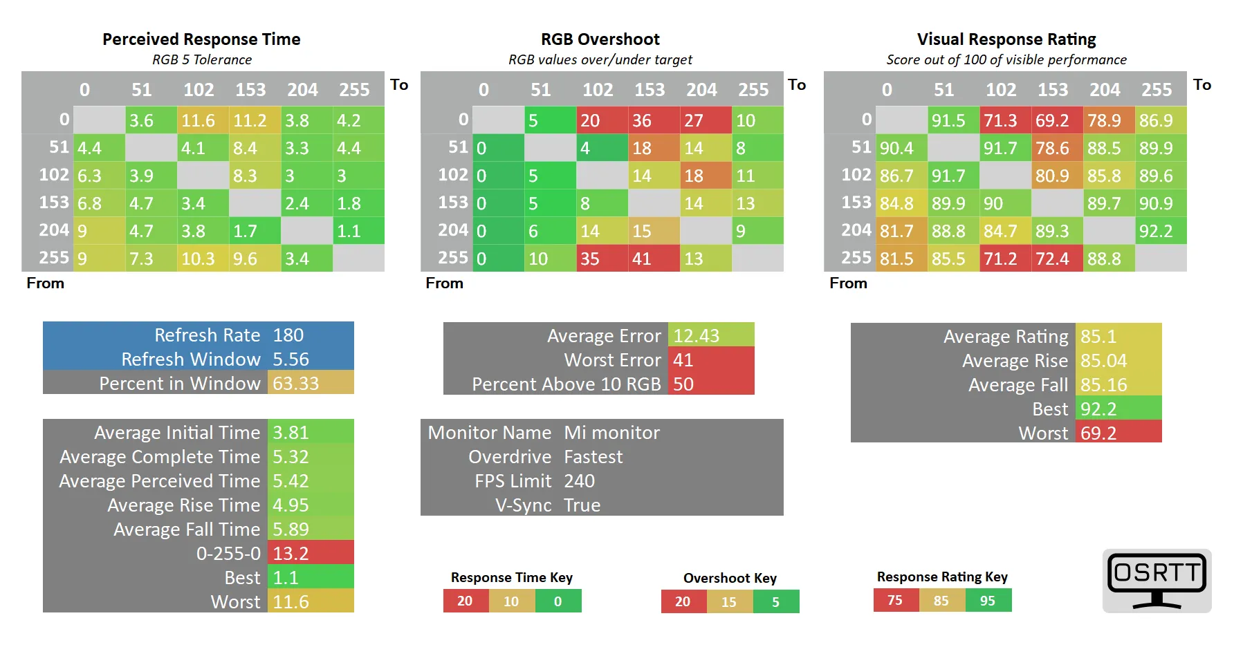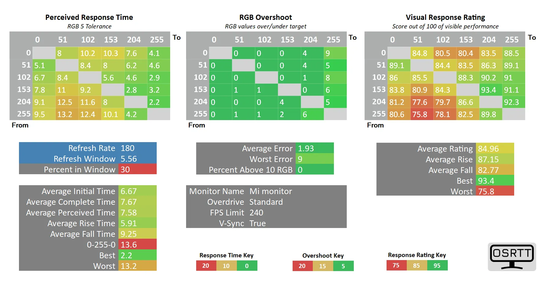 При настройках Ovedrive по умолчанию воспринимаемое (Perceived) время отклика между различными оттенками серого составило 5.78 мс, но ради этого инженерам Xiaomi Redmi пришлось слегка пожертвовать точностью такой настройки – присутствуют очень слабые артефакты на паре переходов.