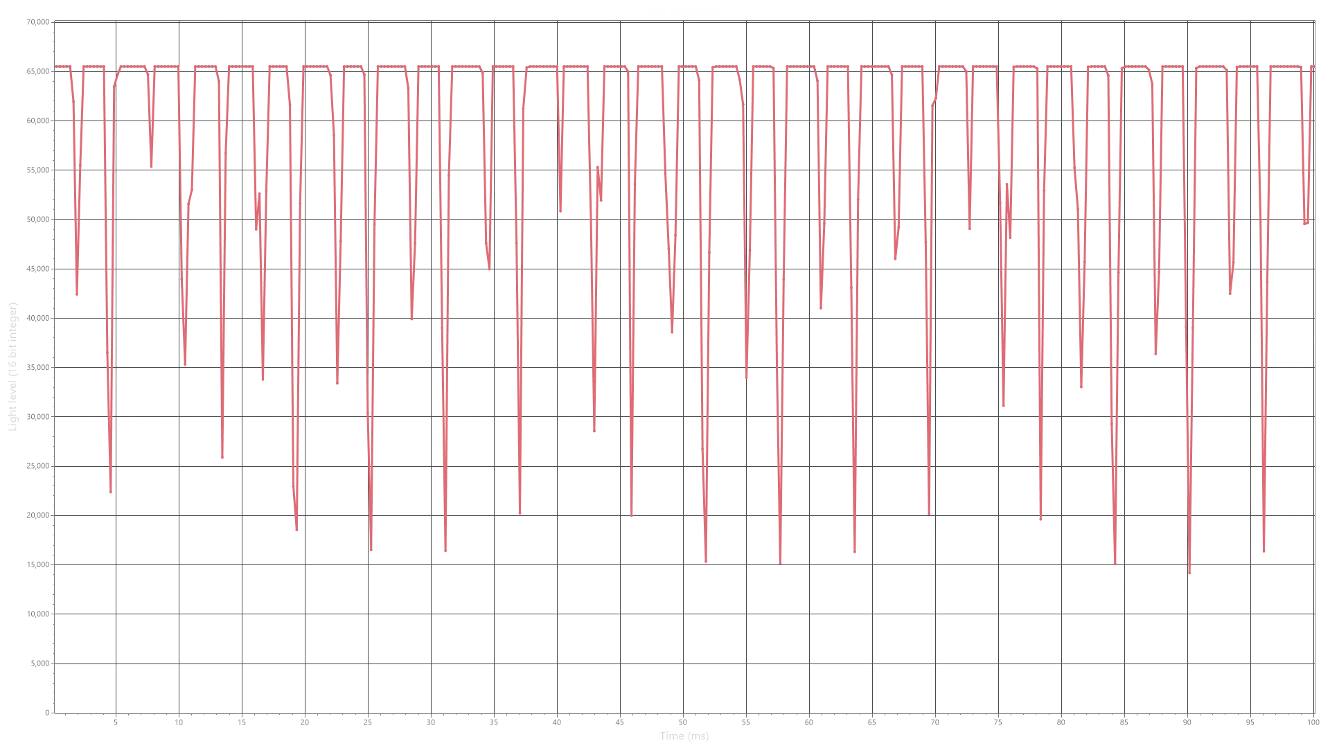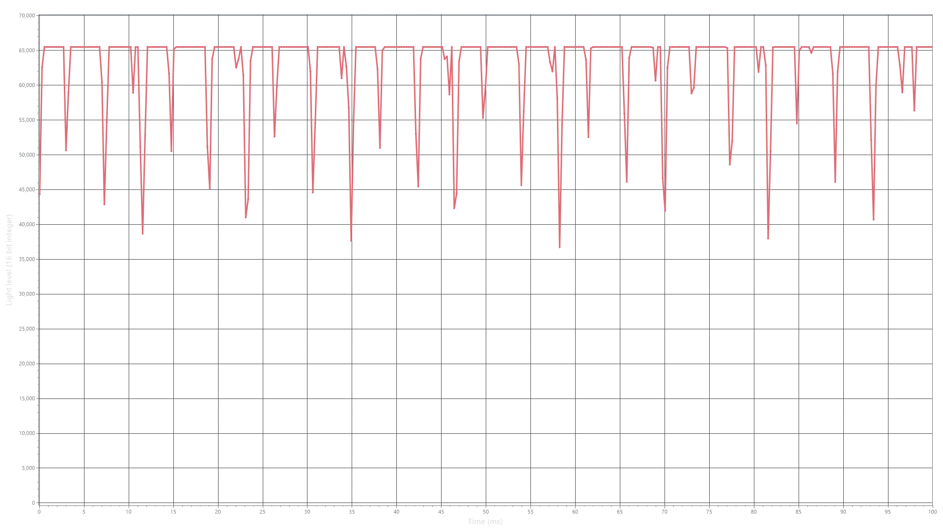 При любых установках яркости есть лишь незаметные для глаз пульсации, что является нормой для технически сложной Mini-LED-подсветки. Пульсации по прибору Radex Lupin (который, безусловно, имеет определённые погрешности, особенно на низких уровнях яркости) в зависимости от яркости находятся на следующих уровнях: