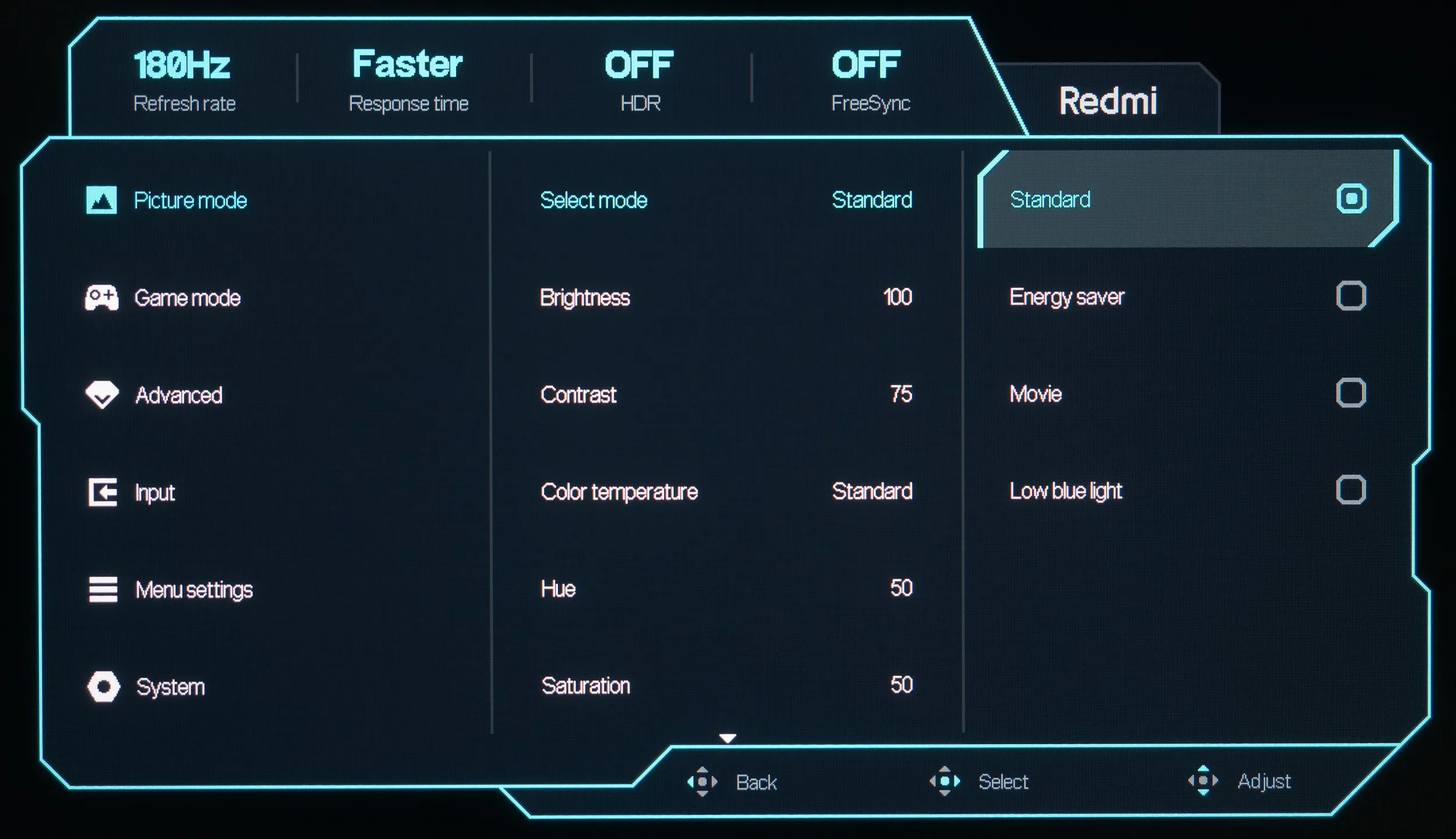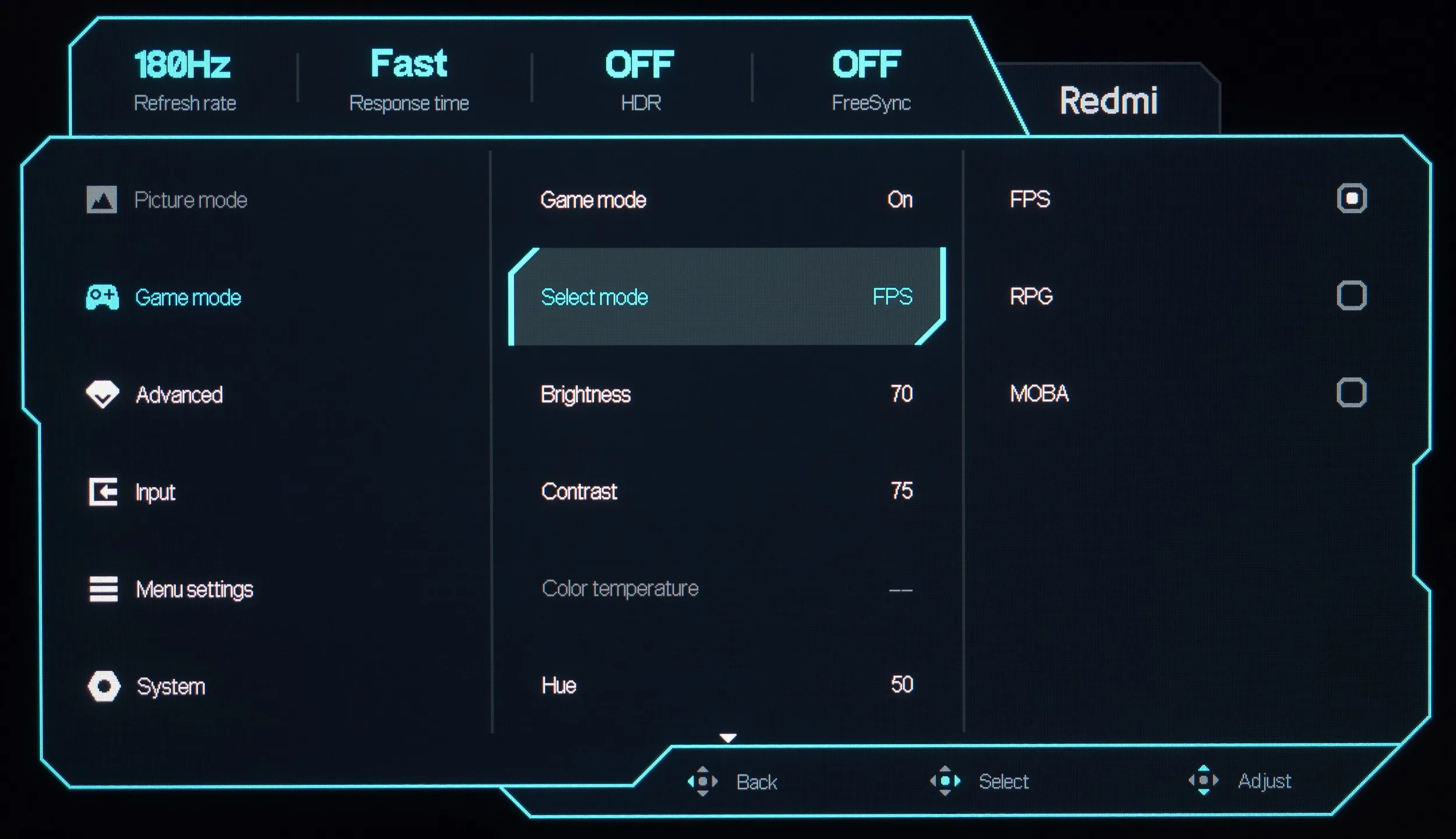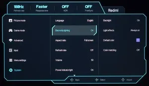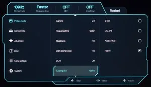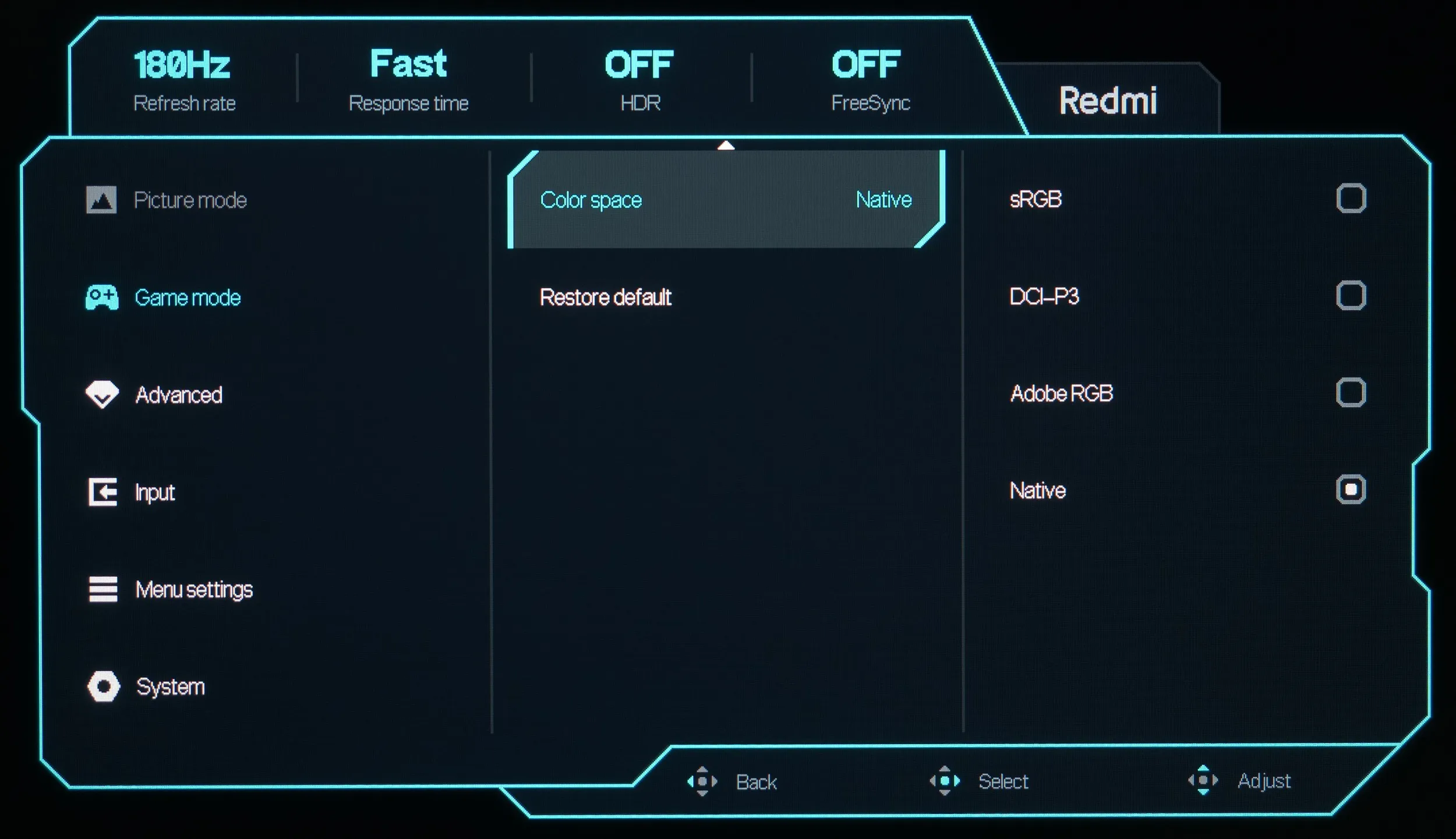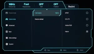 Как и другие игровые модели, новый Xiaomi Redmi Display G Pro поддерживает некоторые важные игровые функции: «счётчик fps», стабилизатор чёрного, регулировка скорости отклика. У новинки есть широкий выбор настроенных игровых режимов, возможность проведения эмуляции цветового охвата (на выбор – Native, sRGB, DCI-P3, AdobeRGB), несколько режимов работы системы локальной подсветки (в том числе её дезактивация), а для тех, кто не может обойтись без «новогодней елки» у модели есть простенькая система внешней RGB-подсветки, схожая по своему виду с применяемой в мониторах Samsung Odyssey и некоторых LG из серии UltraGear.