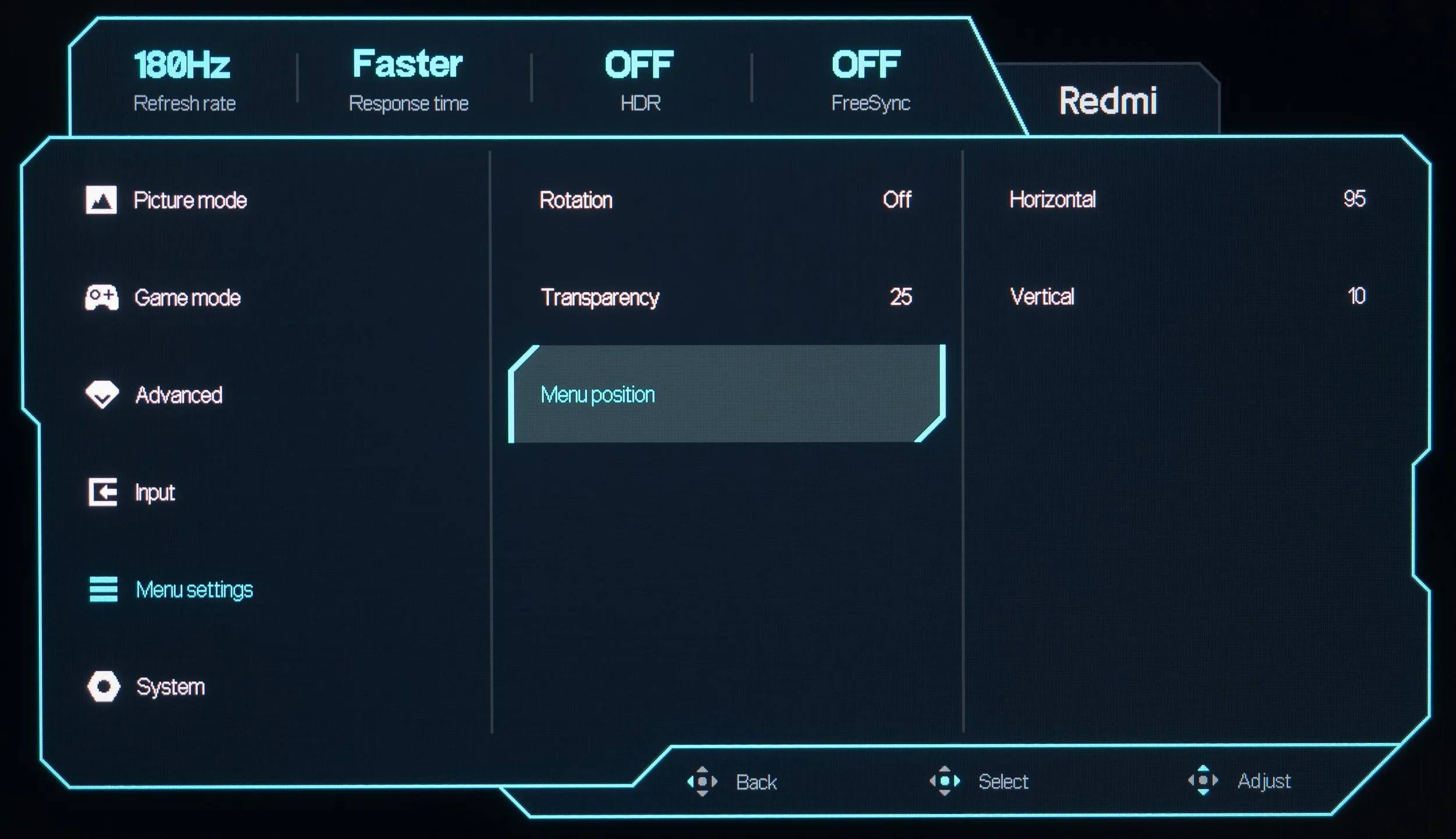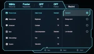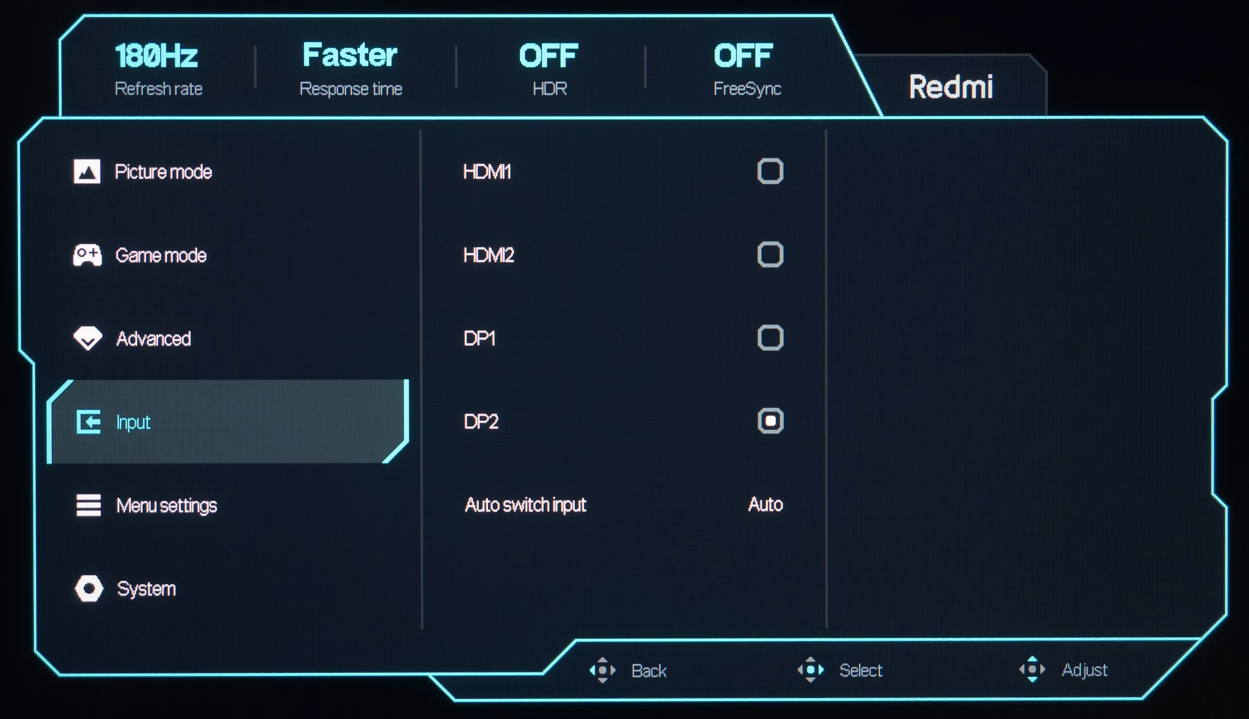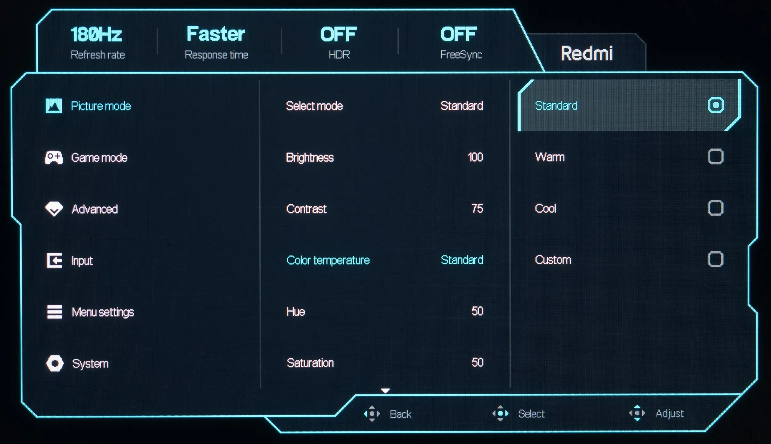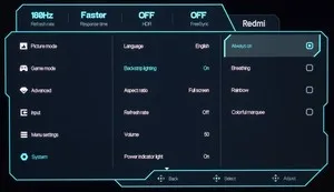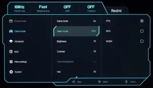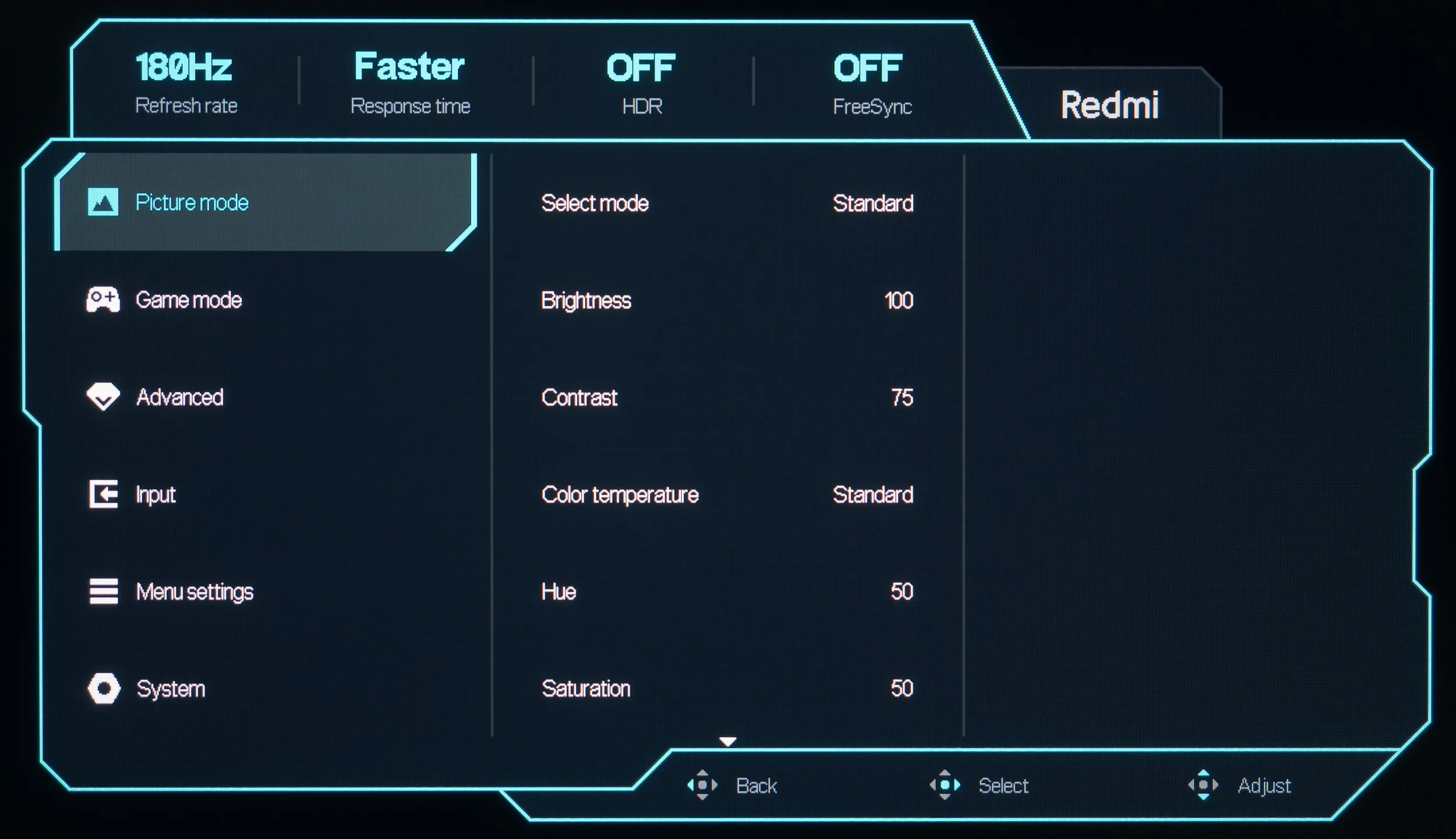 Как и другие игровые модели, новый Xiaomi Redmi Display G Pro поддерживает некоторые важные игровые функции: «счётчик fps», стабилизатор чёрного, регулировка скорости отклика. У новинки есть широкий выбор настроенных игровых режимов, возможность проведения эмуляции цветового охвата (на выбор – Native, sRGB, DCI-P3, AdobeRGB), несколько режимов работы системы локальной подсветки (в том числе её дезактивация), а для тех, кто не может обойтись без «новогодней елки» у модели есть простенькая система внешней RGB-подсветки, схожая по своему виду с применяемой в мониторах Samsung Odyssey и некоторых LG из серии UltraGear.