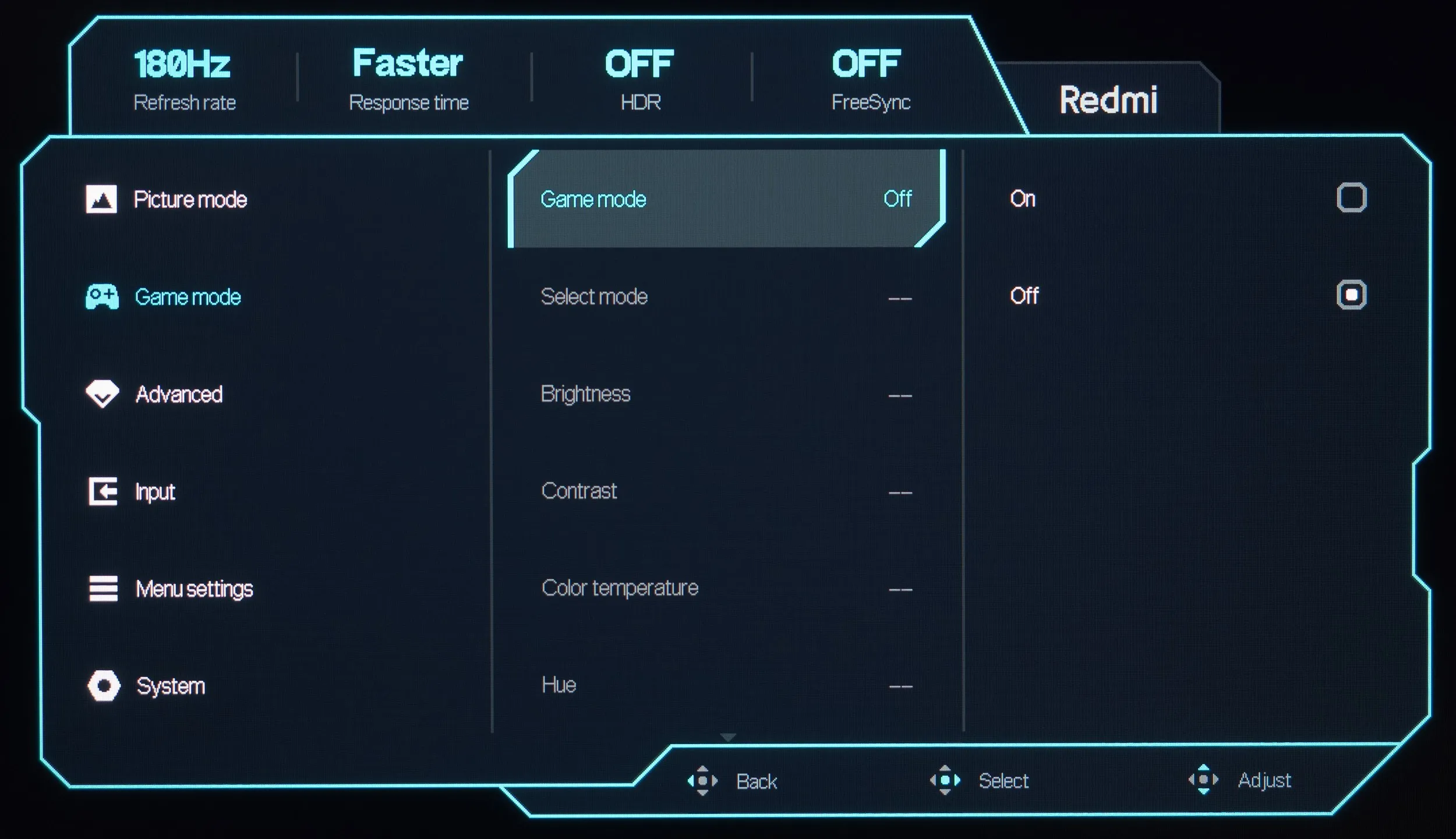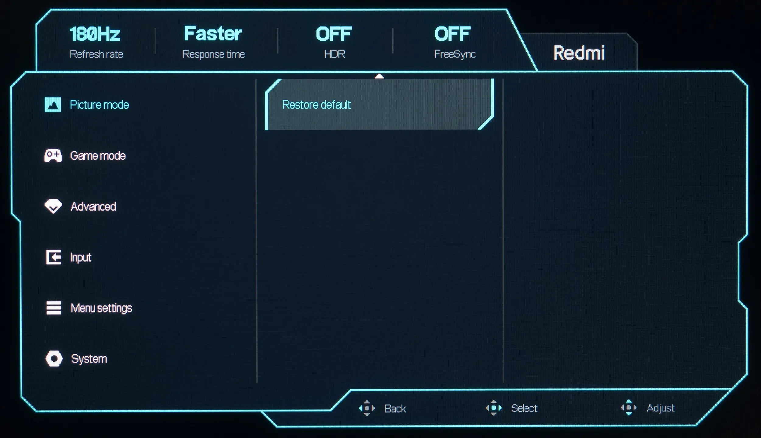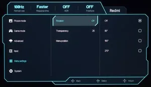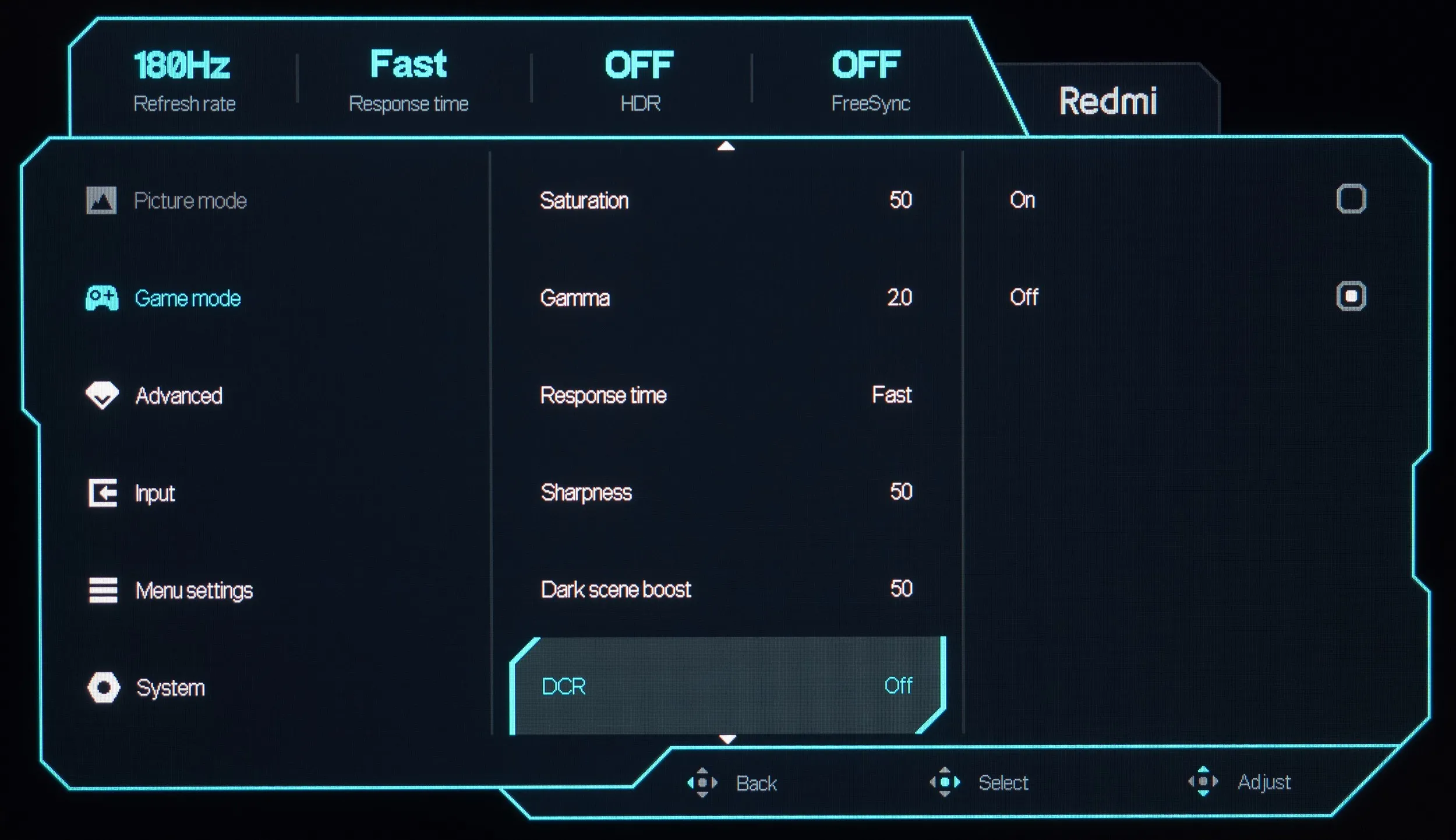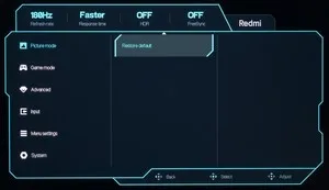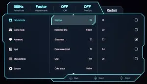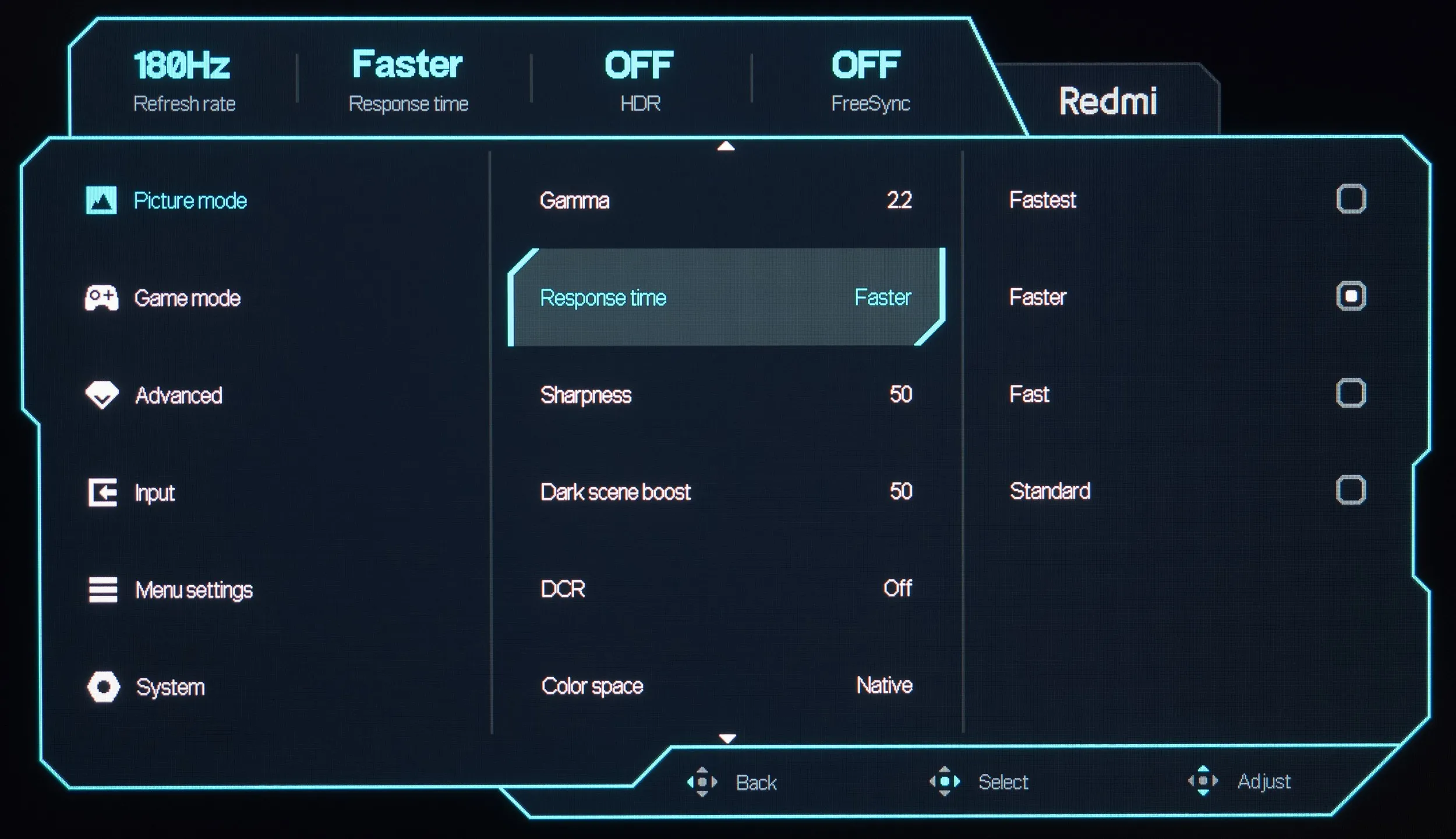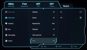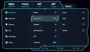 Вместе с тем, для Xiaomi Redmi Display G Pro заявлено время отклика в классические 1 мс GtG, полученные по очень «поверхностным» внутренних методикам измерения. В меню монитора присутствуют режимы Overdrive в количестве четырёх штук. По умолчанию активирован второй режим Fast.
