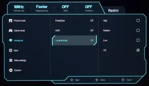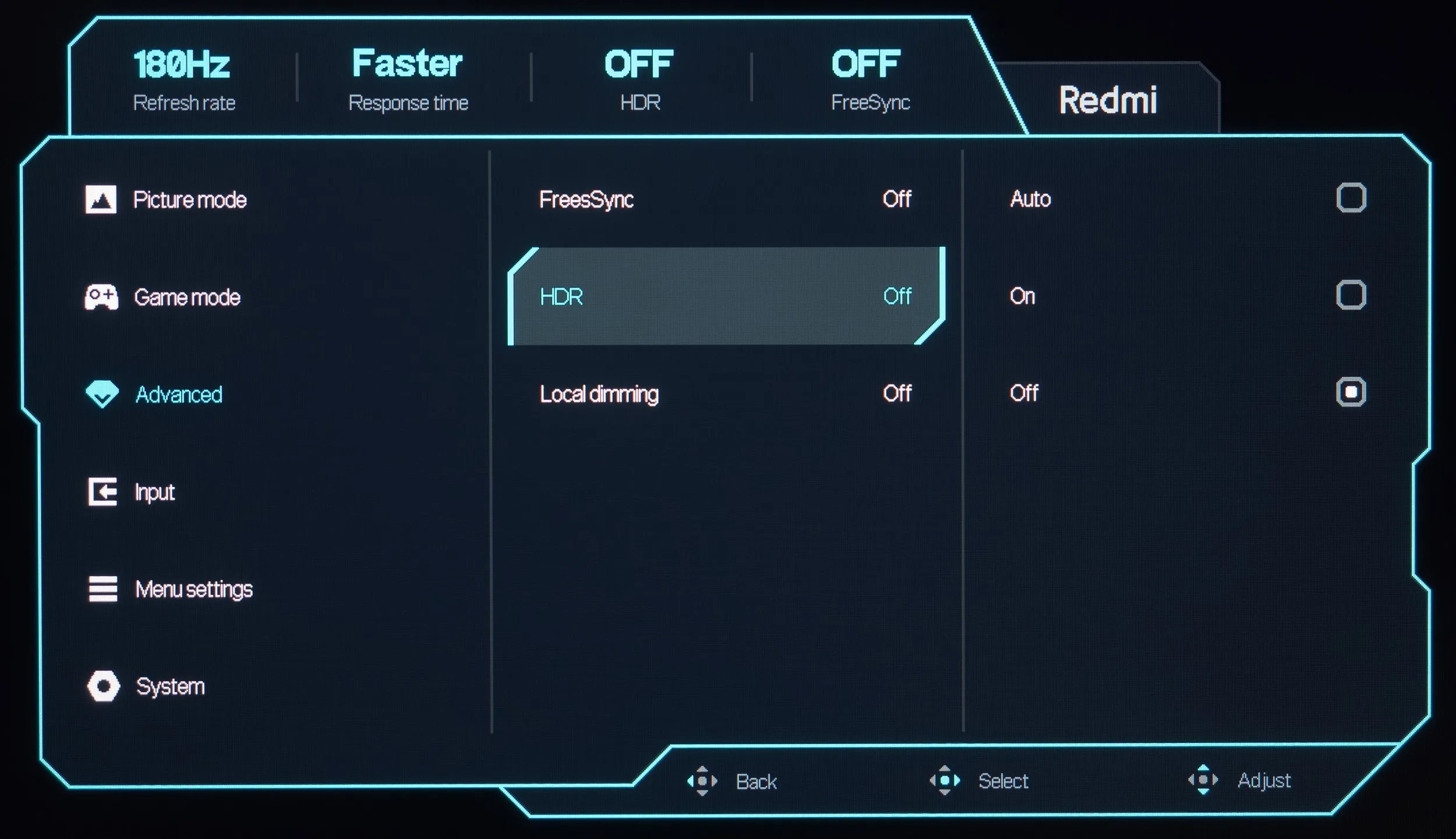 Для активации поддержки систем адаптивной синхронизации, включения HDR (три режима: On, Off, Auto) и переключения режимов работы локальной подсветки (отличаются яркостью работы) представлен третий раздел – Advanced.