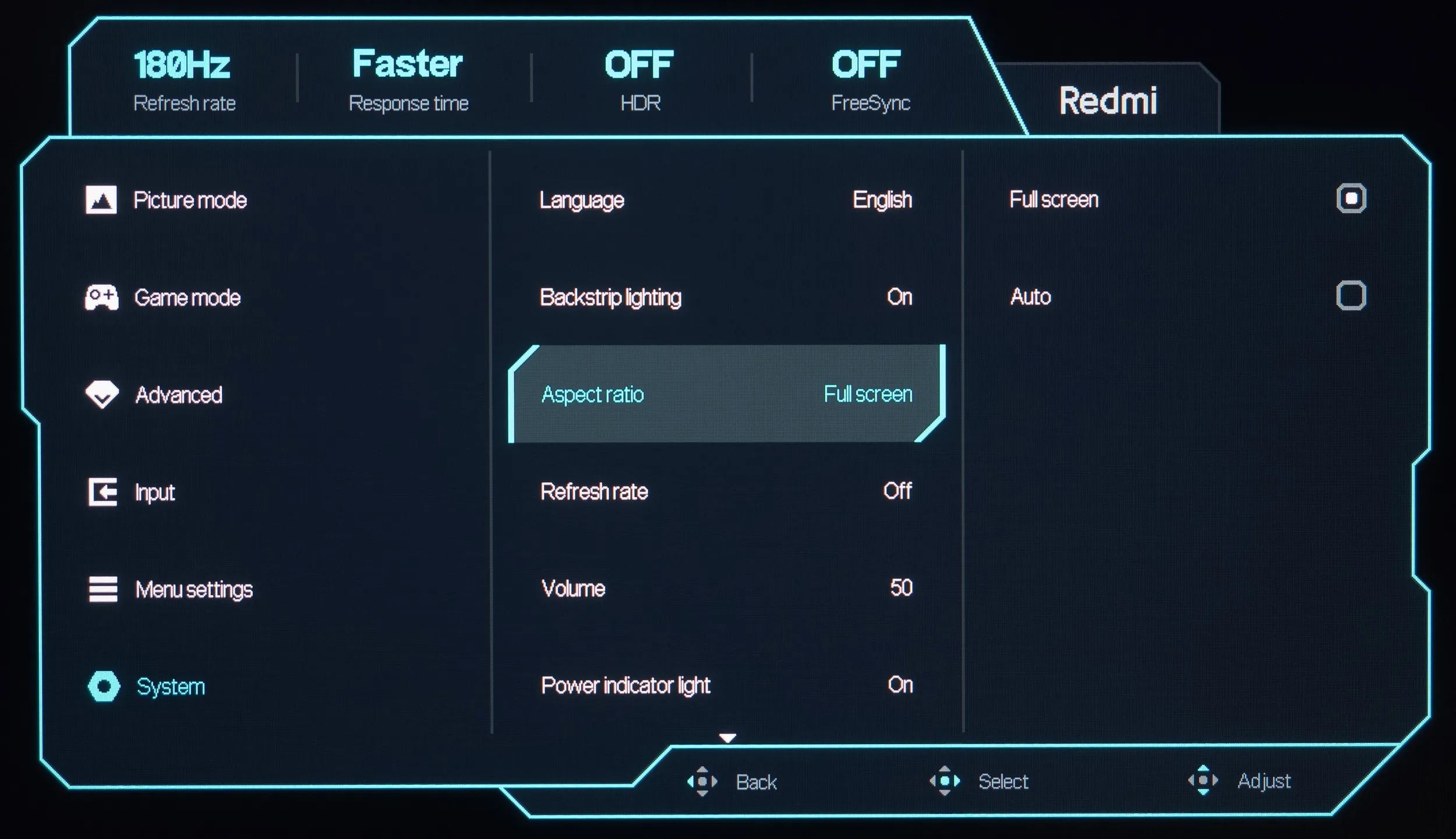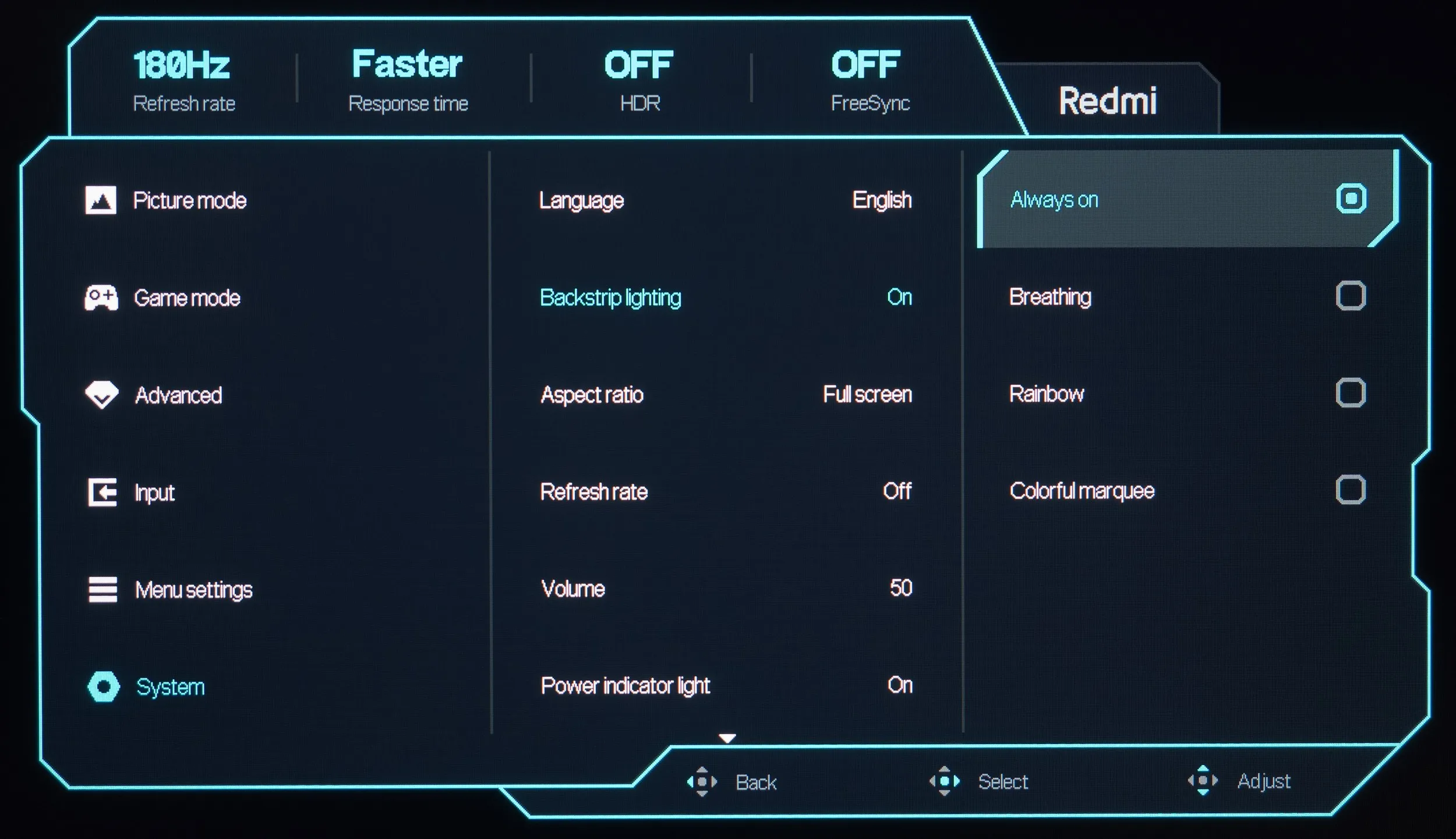 В шестом системном разделе (System) есть выбор локализации меню (английский и китайский языки), активация и настройка работы системы внешней RGB-подсветки, выбор режимов работы встроенного скалера, активация «счётчика fps», регулировка громкости для подключенных наушников или простенькой акустической системы, выбор режима работы индикатора питания. Есть небольшой раздел с информацией об устройстве и функция сброса всех настроек к заводским.