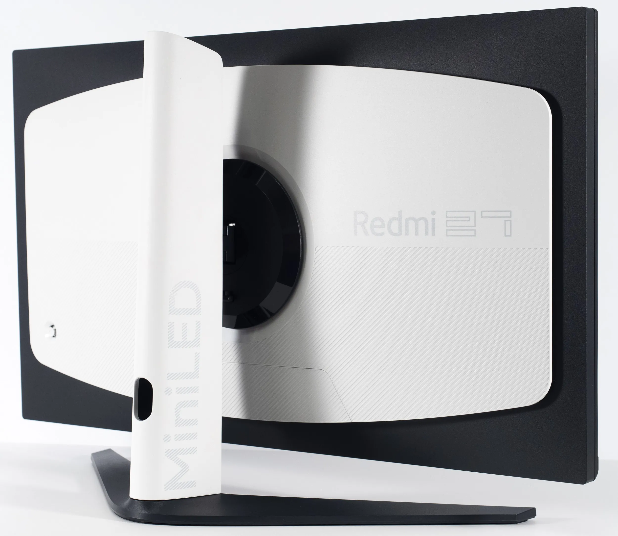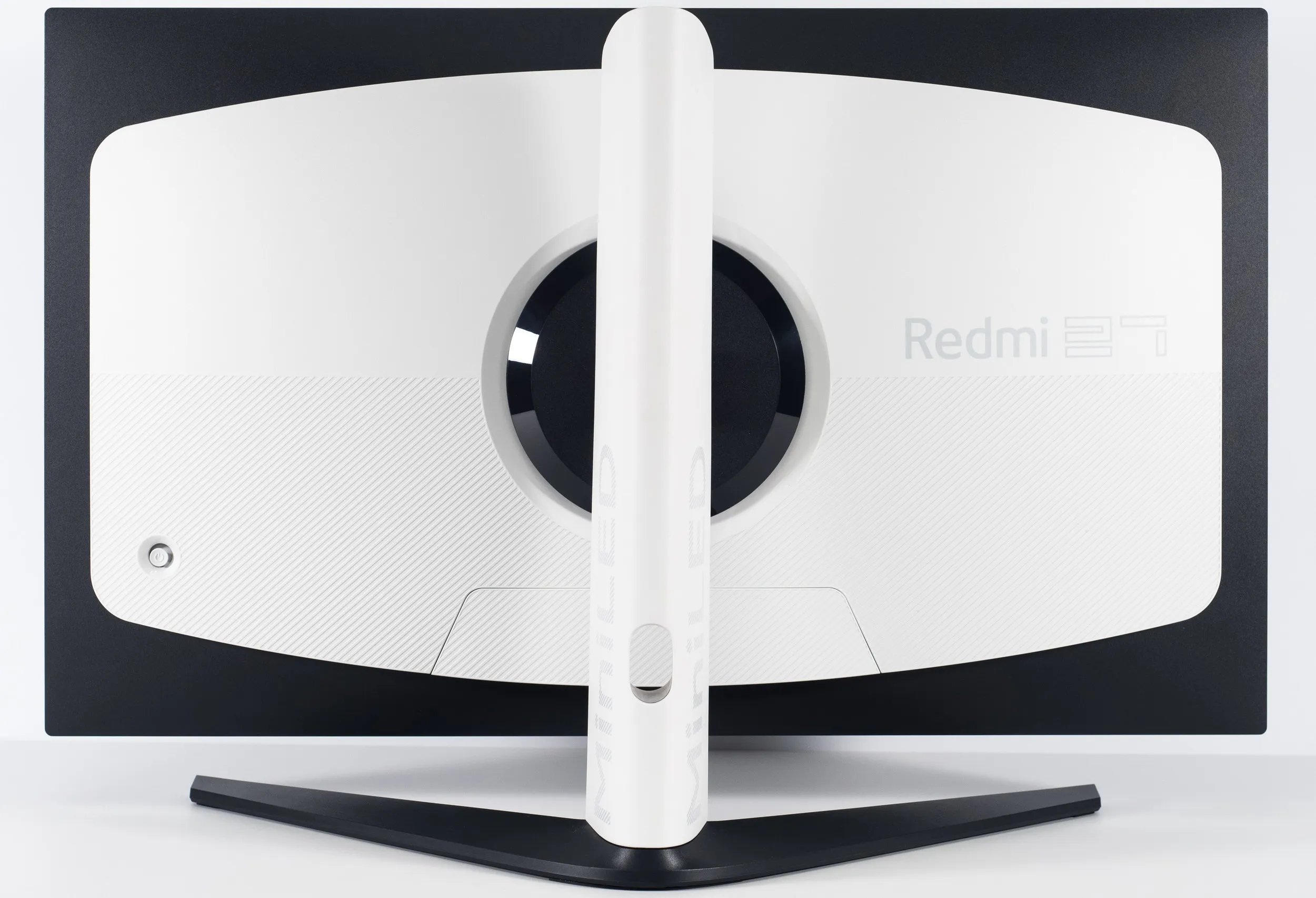 Черно-белую стилистику, похоже, позаимствовали у американской Dell Alienware, рядом с логотипом Redmi в задней части корпуса красуется некое подобие «лого зоны 51», а лакированная круглая накладка с зоной RGB-подсветки переносит нас к моделям Samsung Odyssey. Ножка же новинки напоминает часть решений от игровых LG.
