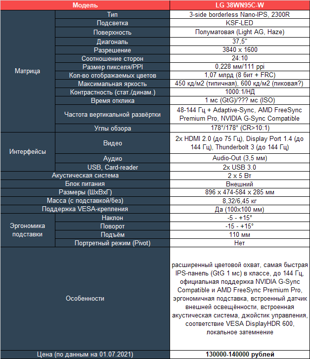 Прямых конкурентов у 38WN95C-W за прошедший год так и не появилось, а поэтому LG находится в выигрышном положении. Впрочем, именно по этой причине цена модели остаётся на высоком уровне и, вероятно, не планирует снижаться. В тоже время 34-дюймовые IPS-решения с высокой частотой и чуть меньшим разрешением (3440 х 1440 пикселей) опустились до 50 тысяч рублей, а в некоторых случаях даже ниже.