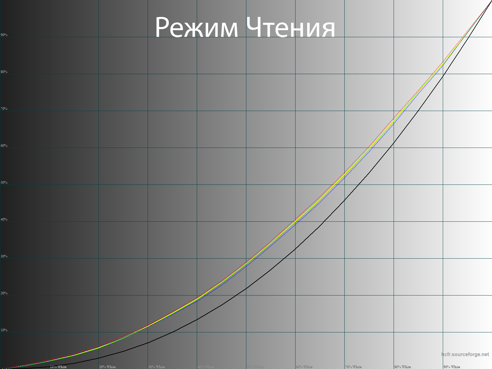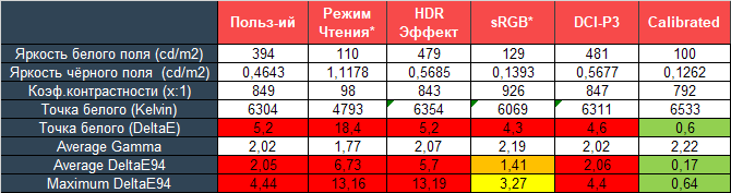 Режим «Чтение» резко меняет яркость и цветовую температуру и прекрасно подходит ровно для того, для чего его создавали: снижена нагрузка, в том числе за счёт значительного подъёма в области с глубокими тенями для снижения контрастности картинки. В свою очередь в HDR Эффект наблюдается сильный дисбаланс RGB, снижена различимость в светах (часть цветов рано уходит в перенасыщение), тени очень глубокие, а баланс серого в разы хуже, чем при настройках по умолчанию.