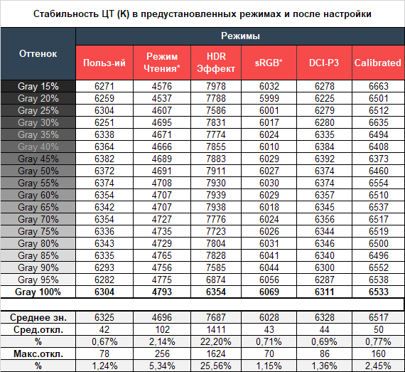 Уровень стабильности цветовой температуры при заводских установках оказался достаточно высоким. Но ещё лучше показали себя два режиму эмуляции sRGB и DCI-P3. Достаточно хорошая стабильность ЦТ оттенков серого и в режиме для Чтения, а вот HDR Эффект оказался не лучшим представителем среди всех предустановленных пресетов, продемонстрировав уровень в 22-26 % - плохо, очень плохо.