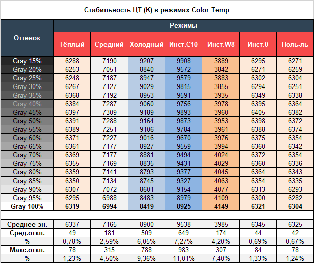 Теперь рассмотрим результаты специальных режимов Color Temp. Напомним, что по умолчанию производитель установил пресет “Пользователь” со значениями RGB 50/50/50. Поэтому стоит учитывать, что значения его столбца полностью совпадают с результатами режима «Пользовательский» из первой таблицы данного подраздела тестирования. Остаётся лишь поговорить про четыре оставшиеся предустановки ЦТ с разными значениями и расширенные настройки точки белого: