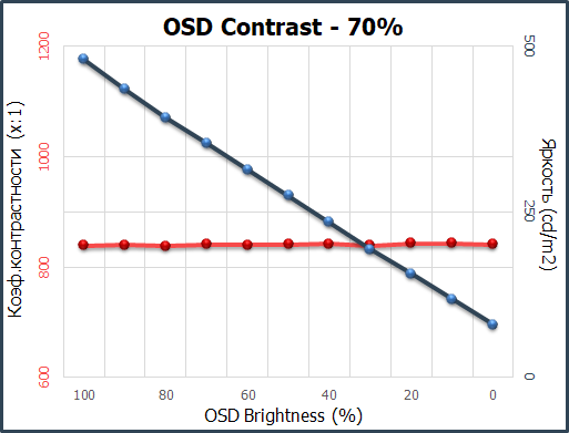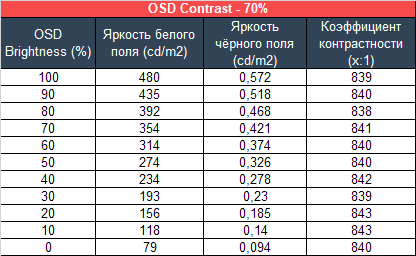 Для изучения стабильности контрастности и диапазона изменения яркости был выставлен режим Игрок 1. Значение Brightness менялось с 100 до 0% с шагом в 10 единиц. Для представленной ниже таблицы измеренные значения были получены через программу HCFR, которая даёт возможность более точно оценить уровень чёрного (три знака после запятой) и соответственно определить достоверный коэффициент контрастности.