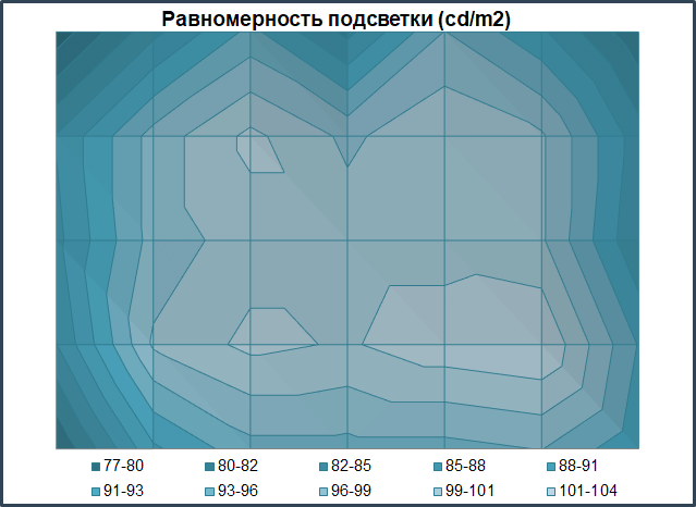 По представленной диаграмме поверхности можно наглядно увидеть, как сосредоточен уровень яркости по полю матрицы. У нашего экземпляра в основном затемнены только боковые части панели и верхний левый угол. В остальном же яркость на большей части периферии близка к установленной в центре.