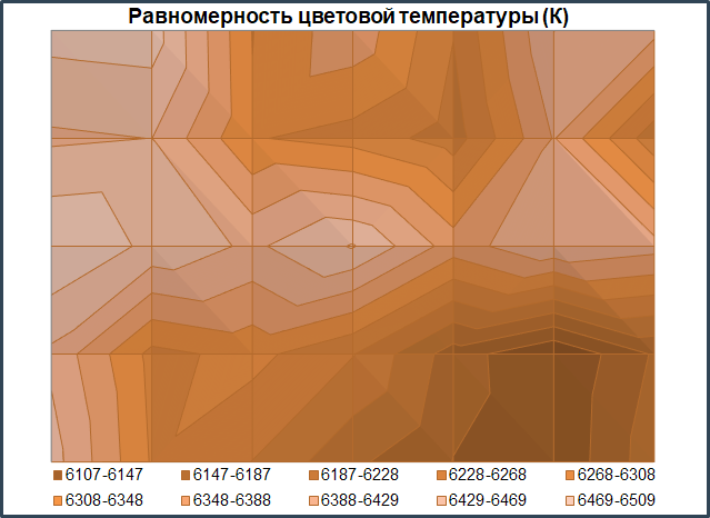 Диаграмма поверхности сильно отлична от таковой по равномерности яркости на белом поле. Картина тут совсем другая. Цветовая температура меняется хаотично и на небольшие величины. Тем не менее, каких-либо визуальных изъян, различимых во время работы, у героя обзора нет.