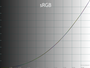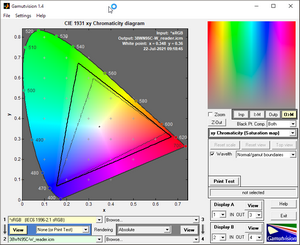 Первоначальная проверка осуществлялась при заводских настройках дисплея в режиме Пользовательский. По представленным скриншотам видно, что две опорные точки из трёх заметно сдвинуты в пространстве относительно стандартного цветового стандарта sRGB, превосходя его на многих участках. В сравнении с ещё более широким AdobeRGB монитор проигрывает ему на зелёных и бирюзовых полутонах, но значительно опережает на красных, что является нормой для монитора подобного рода.