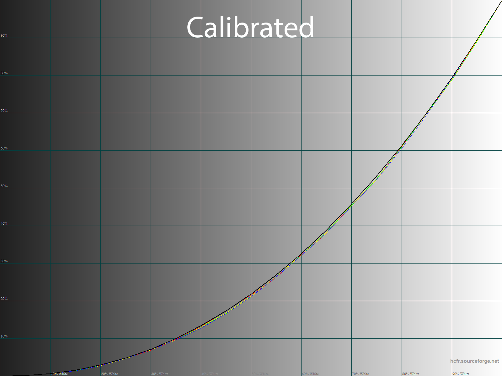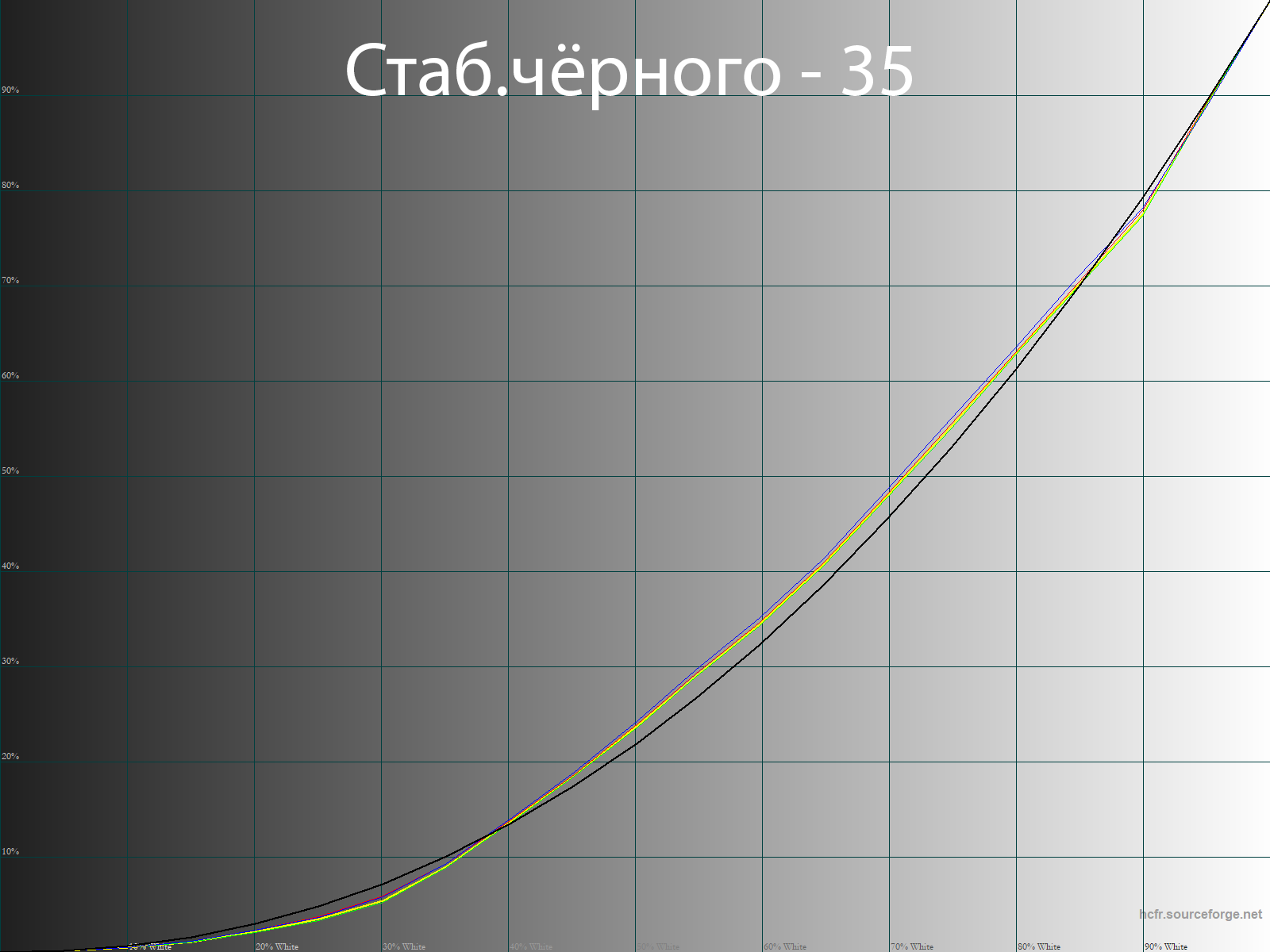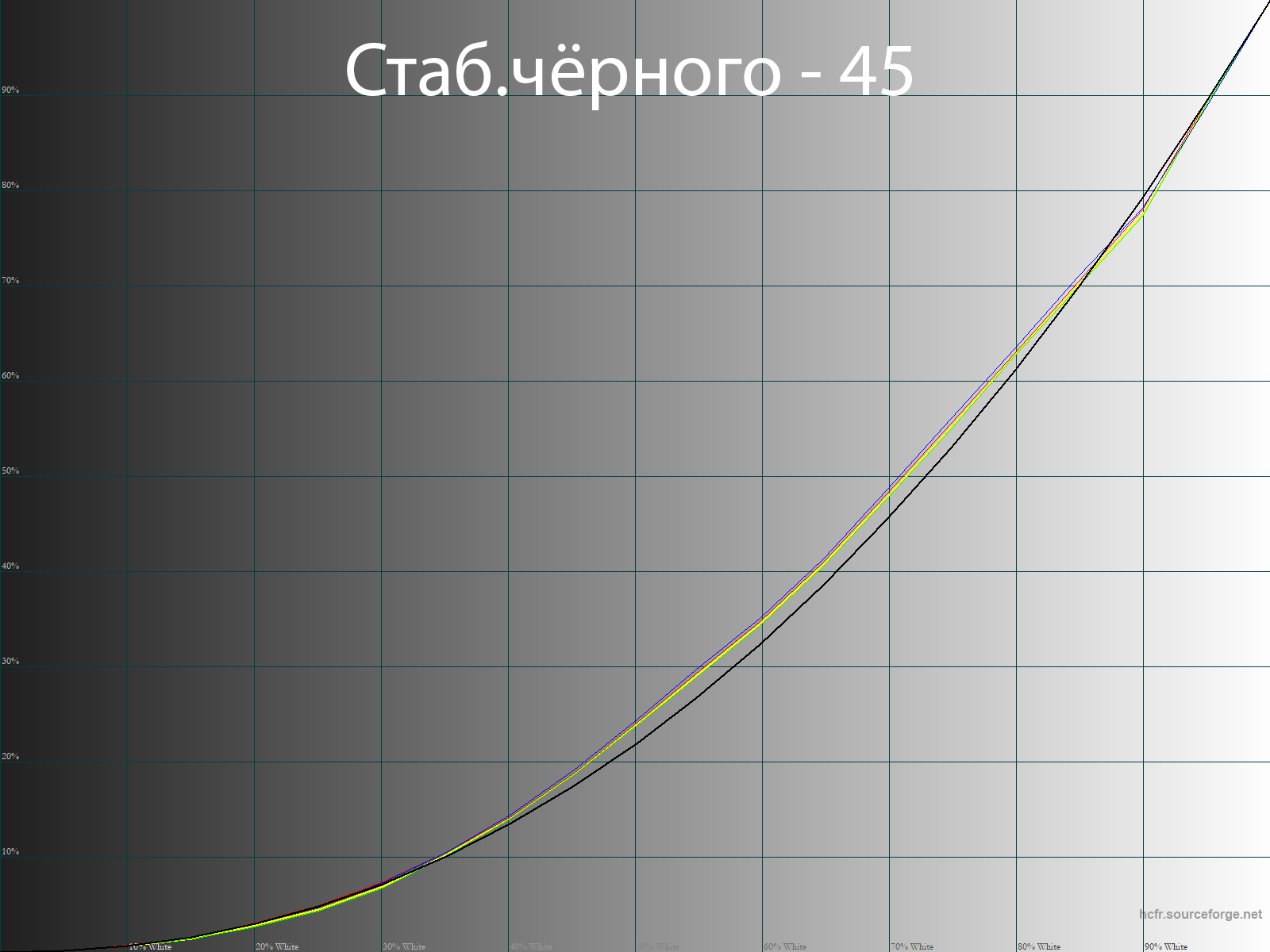После ручной настройки и калибровки мы получили идеальные гамма-кривые, точки серого клина лежащие в области DeltaE<3 с достаточно высокой стабильностью ЦТ, чем при стандартных установках, и близкую к референсу White Point.