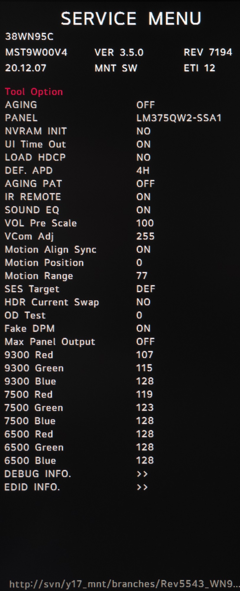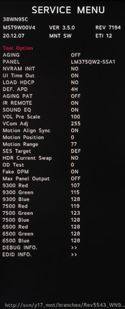 Благодаря полученному доступу к сервисному меню мы подтвердили используемую матрицу, узнали версию прошивки, скалера изображения, ревизию монитора и более точную дату производства. В списке присутствует большое количество неизвестных параметров, а поэтому менять что-либо без полного понимания «что к чему» - точно не следует.