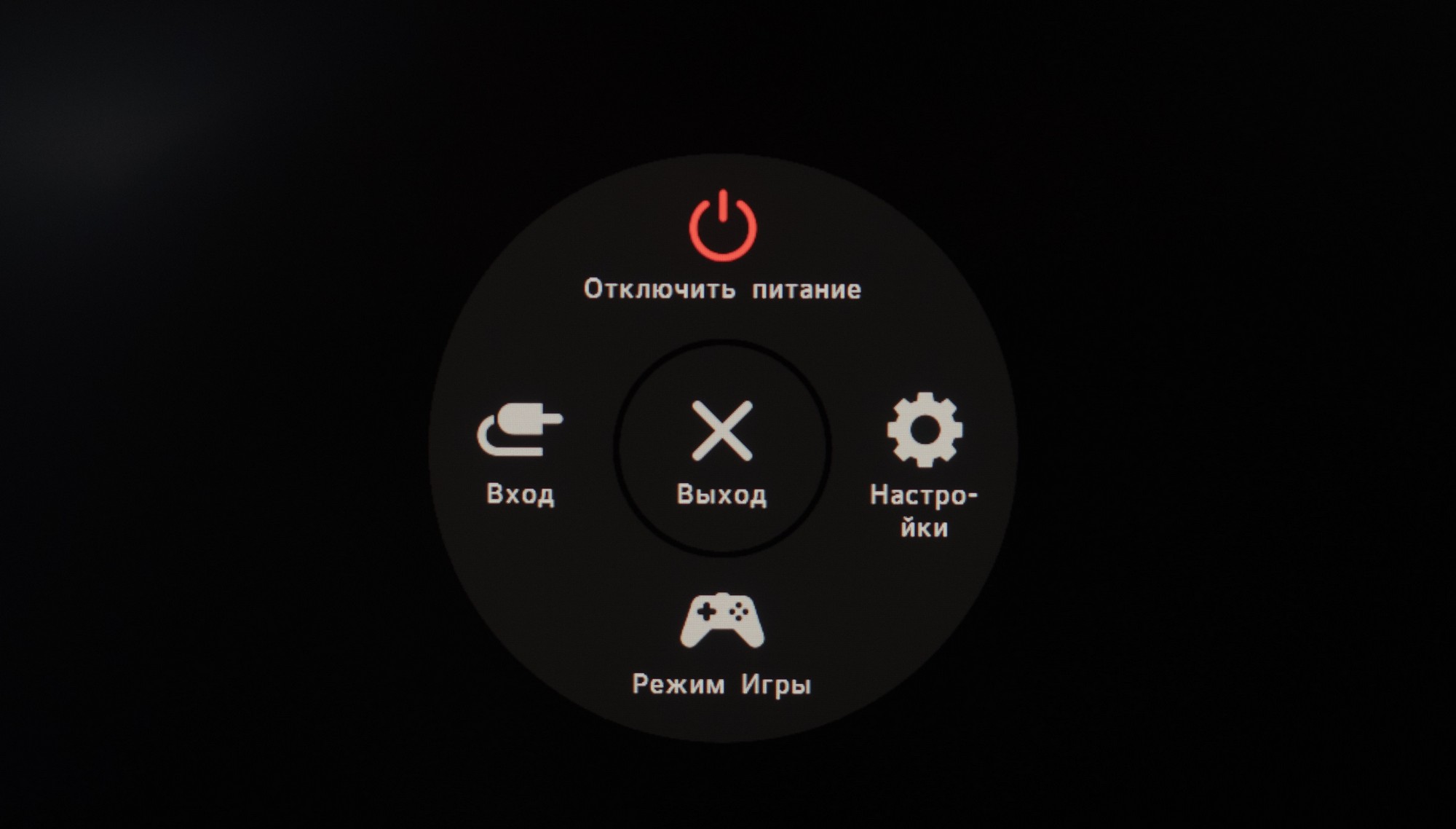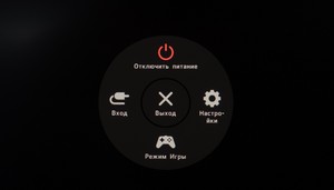 Нажатие джойстика проводит к появлению на экране специального кругового OSD меню с пятью пиктограммами. Через них можно попасть в основное меню, перейти к игровым настройкам, выбрать источник сигнала, выключить монитор и убрать меню. С помощью сдвига джойстика влево-вправо можно попасть к быстрой регулировке уровня громкости, а вверх-вниз покажет информацию по рабочему интерфейсу и выбранному режиму изображения.