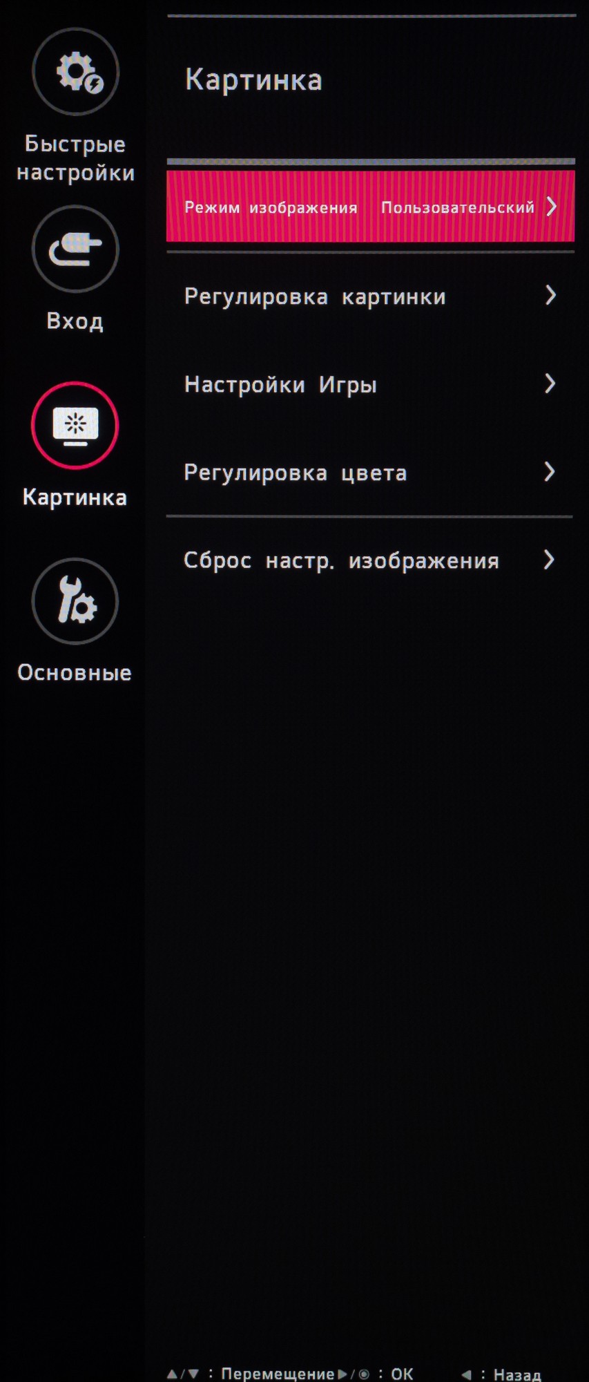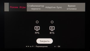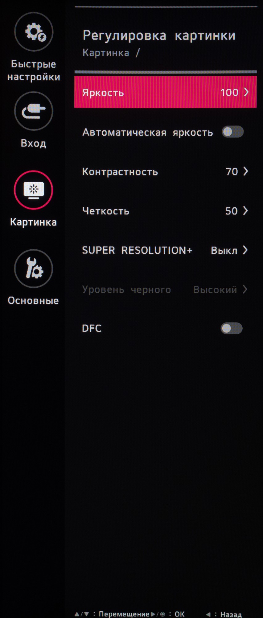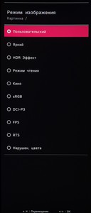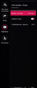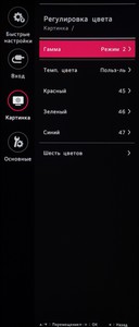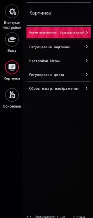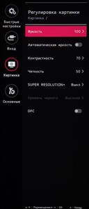 Раздел «Картинка», как и всегда, поделен на четыре подраздела. В первом выбирается предустановленный режим изображения, среди которых много игровых пресетов. Во втором находятся настройки яркости, контрастности, специальные параметры типа усиления резкости, настройки глубины чёрного при HDMI подключении, специальных технологий типа SuperResolution+ и активации динамической контрастности.