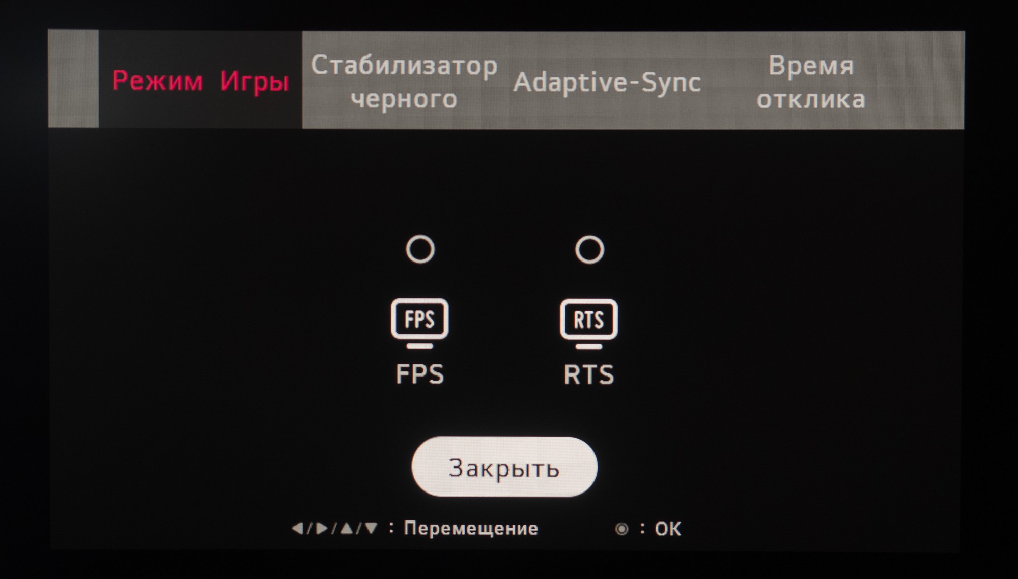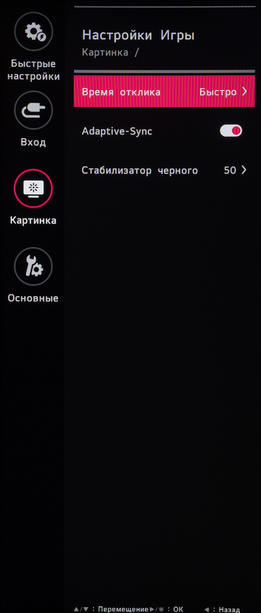 Внешний вид меню рабочих (не игровых, формально) мониторов LG остаётся неизменен на протяжении последних 5-6 лет. Это просто большое чёрное окно во всю высоту экрана, «прилепленное» к его правой части. Про дизайн тут сказать нечего.