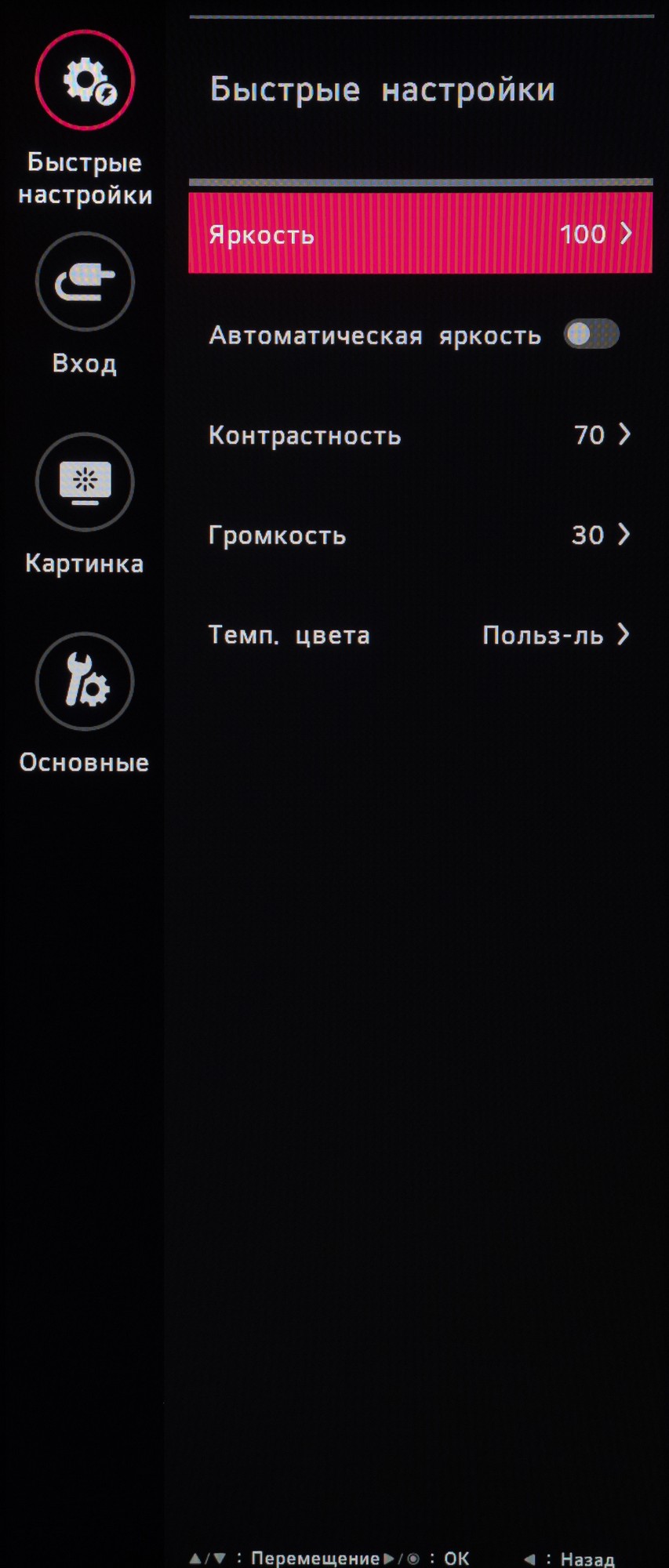 Само меню состоит всего из четырёх основных подразделов, В первом можно регулировать яркость, контрастность, громкость акустической системы, активировать автоматическую яркость и выбрать режим цветовой температуры.