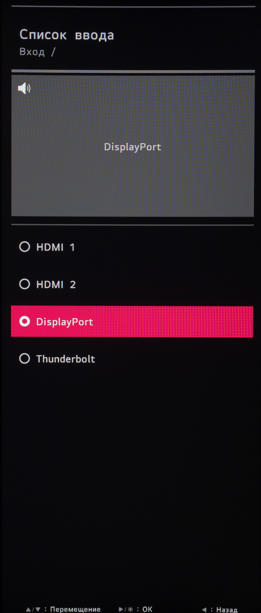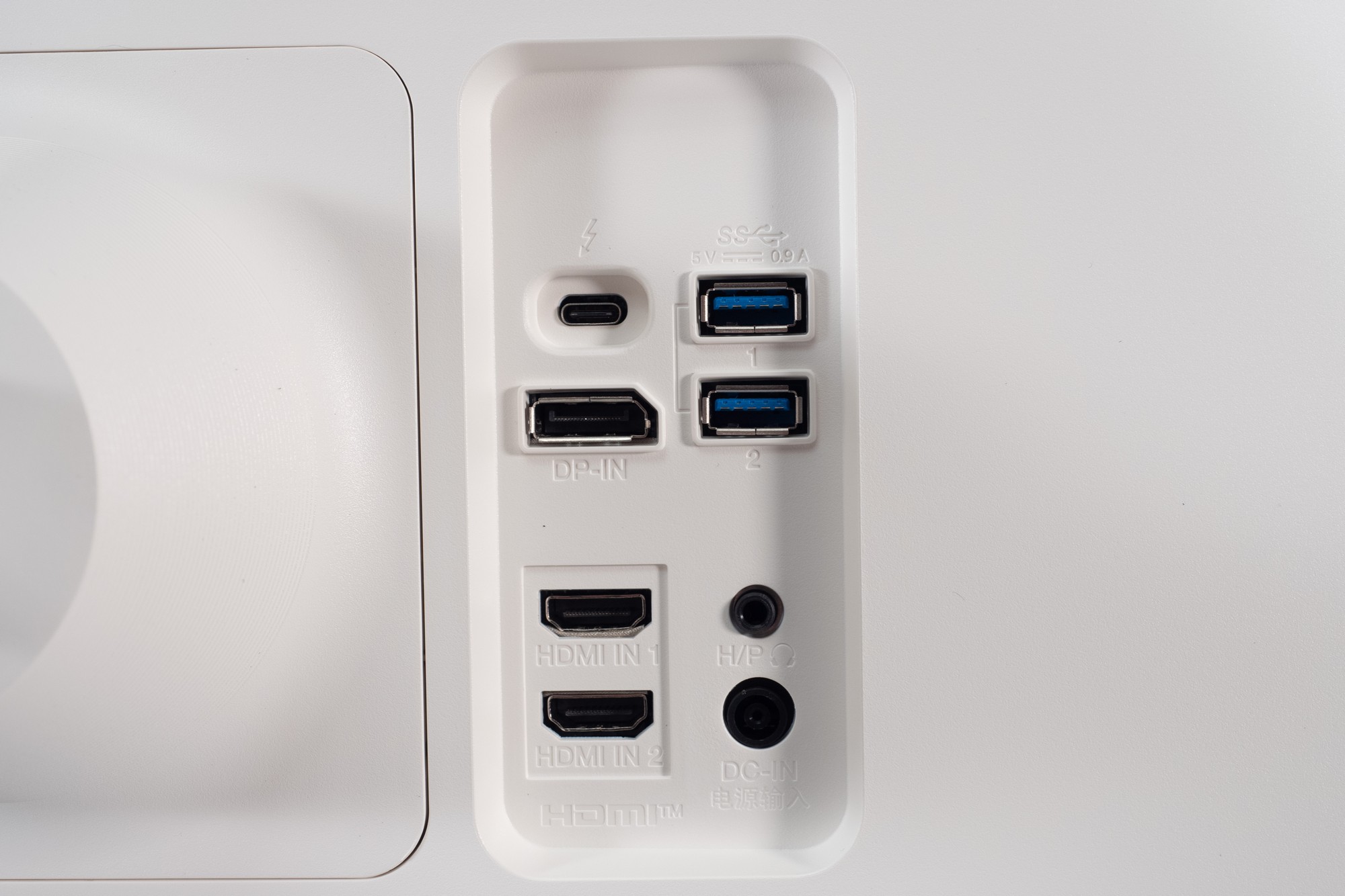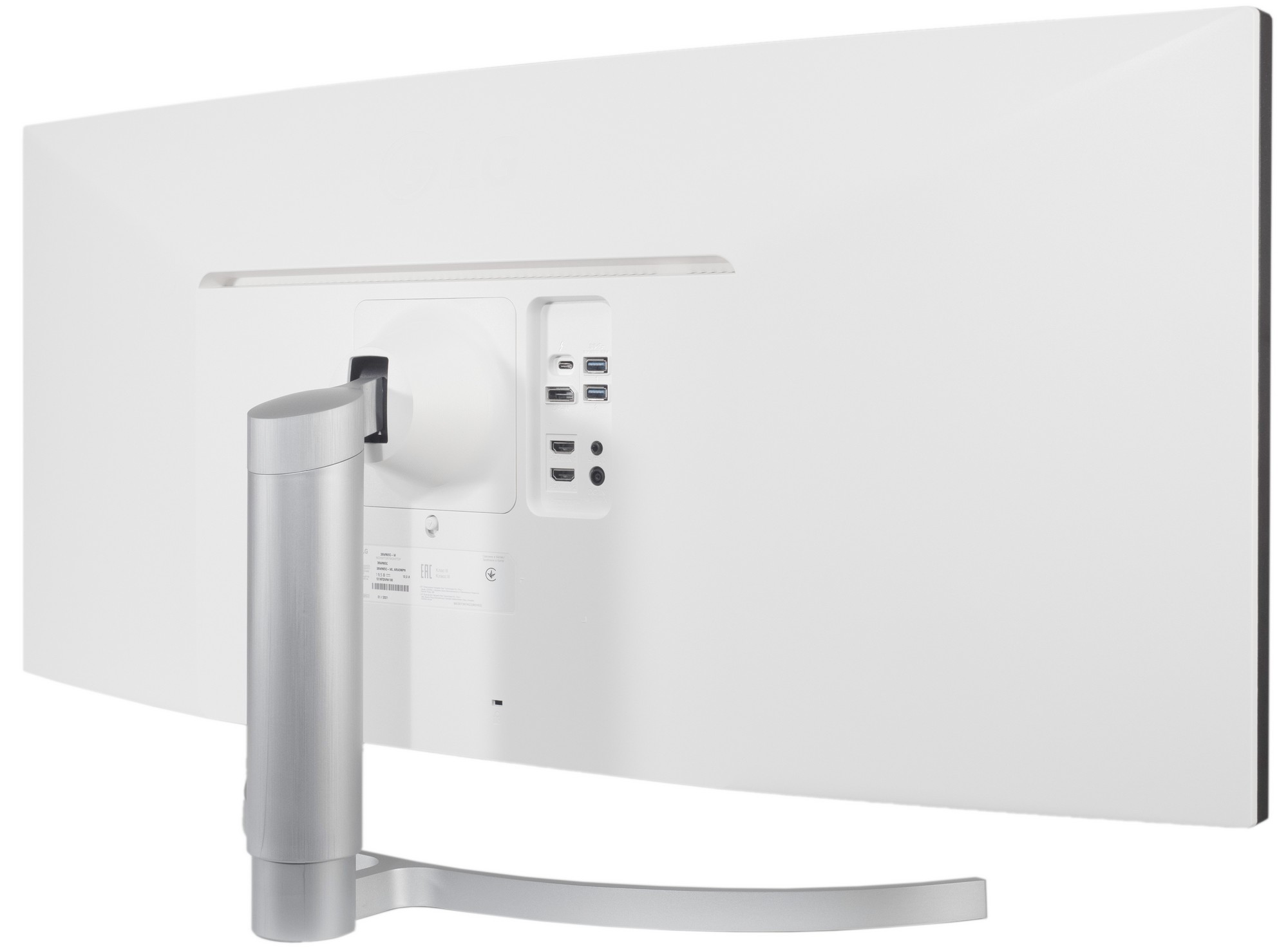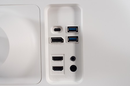 В задней части монитора на колодке для подключения кабелей находятся следующие разъемы, ориентированные назад: питание, DisplayPort 1.4, два HDMI 2.0, USB Type-C (Thunderbolt 3) с возможностью зарядки устройств, два USB 3.0 (USB-хаб) и Audio-Out для вывода звука на наушники или внешнюю акустическую систему.