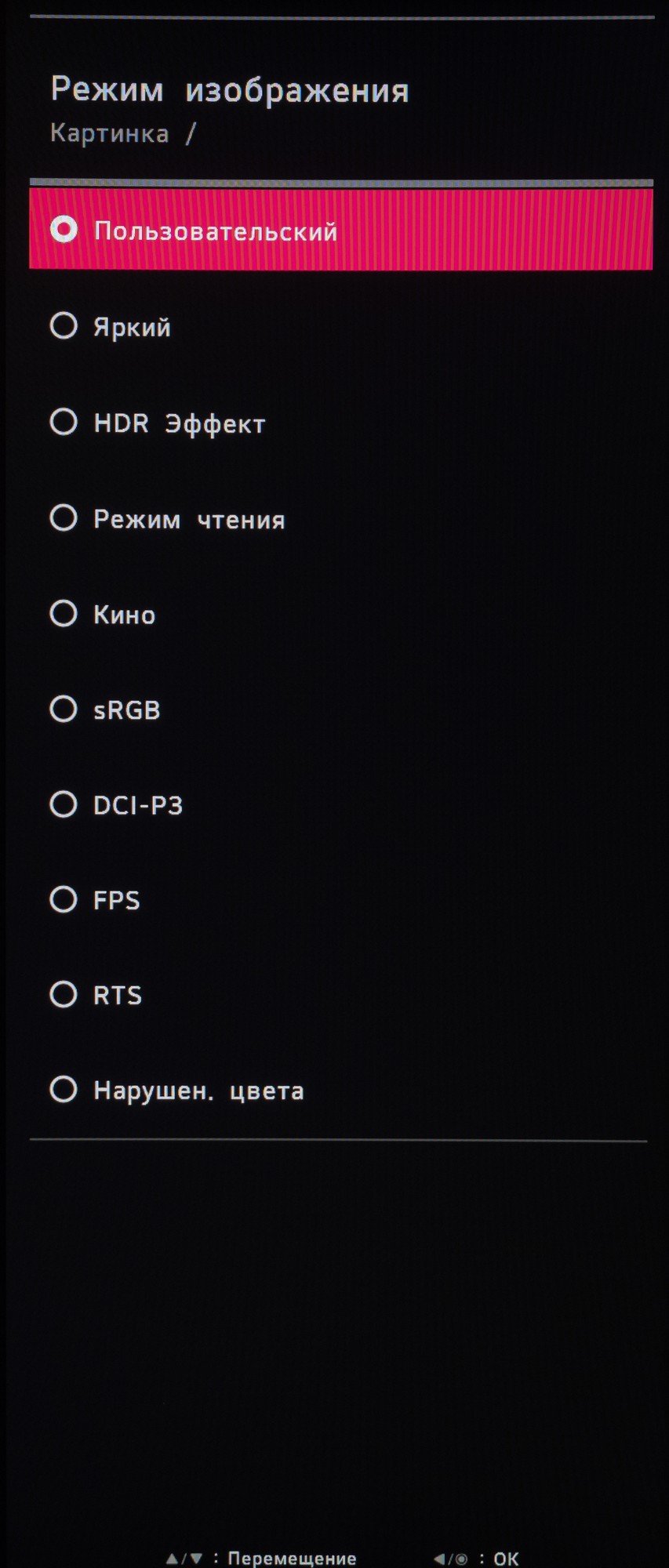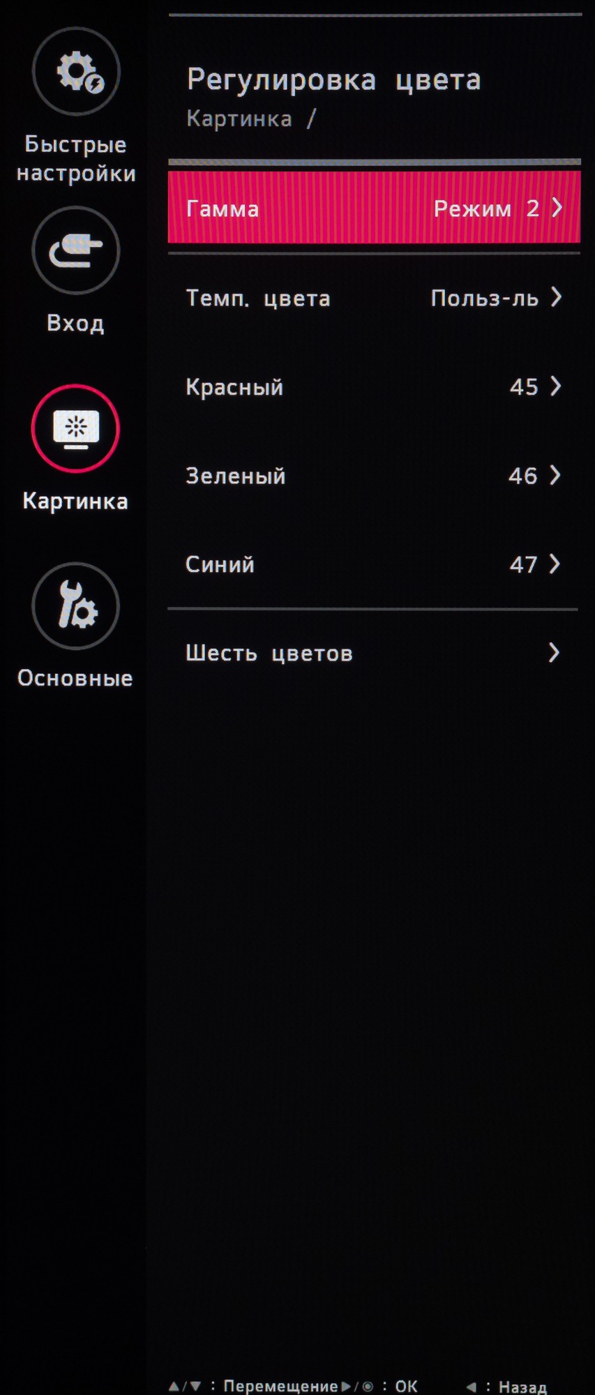 У новинки LG нет каких-либо встроенных датчиков (освещенности, приближения), но есть два важных параметра напрямую влияющих на картинку с экрана. Для начала посмотрим на доступные режимы гаммы при прочих стандартных настройках: