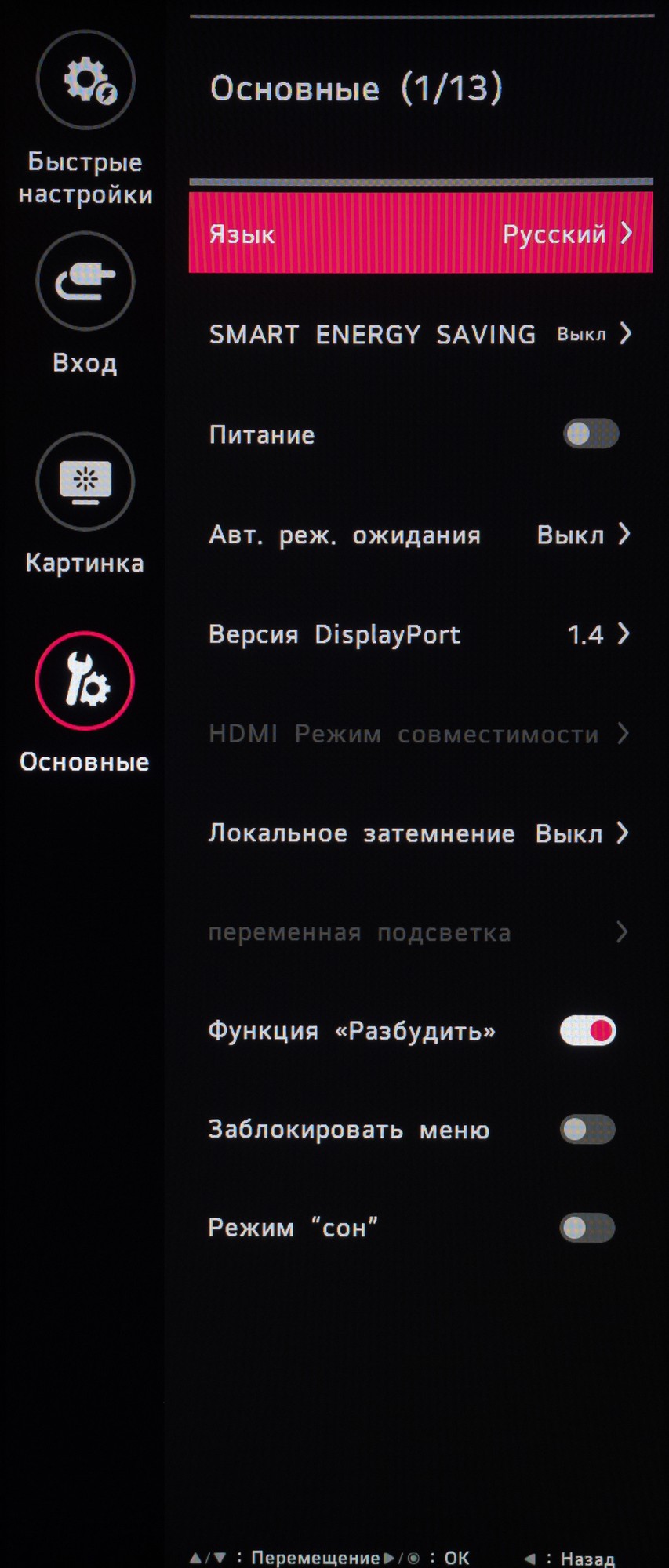 Изменить язык локализации, активировать автоматический переход в режим ожидания, задействовать стандарт DisplayPort 1.4, функцию «Разбудить», включить режим энергосбережения и заблокировать меню – всё это можно сделать в разделе «Основные». Здесь же можно сбросить все настройки к заводским значениям и посмотреть основную рабочую информацию по дисплею в максимально сжатом виде.