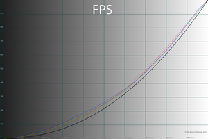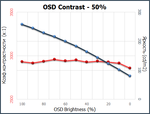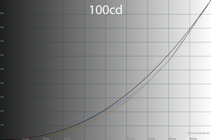 Полученный рабочий диапазон яркости при стандартных настройках составил 80-258 нит при коэффициенте контрастности в ~2910:1 в среднем. Снижение яркости почти линейно, коэффициент контрастности достаточно стабилен во всём диапазоне, а его уровень вплотную подобрался к заявленному производителем.