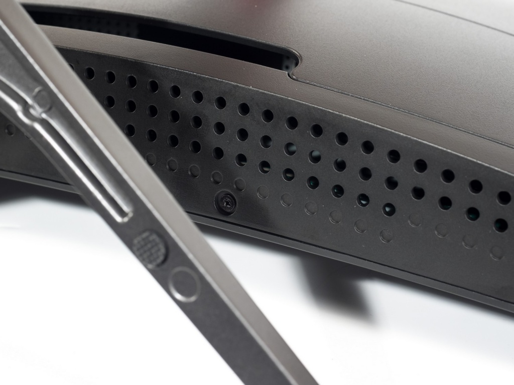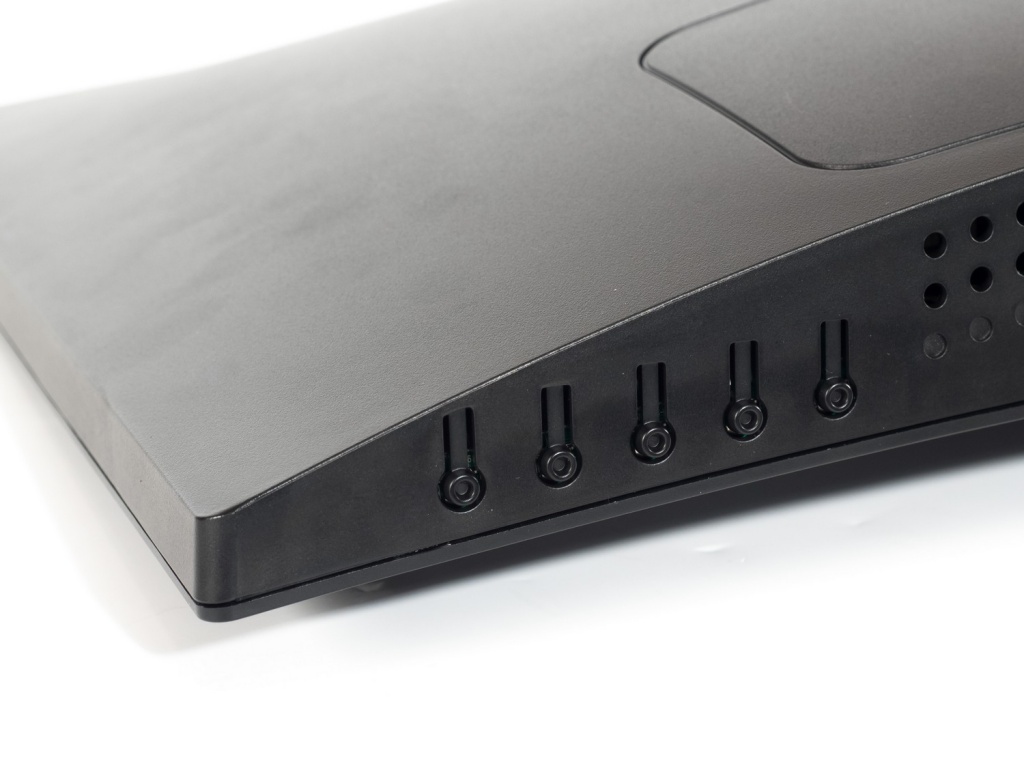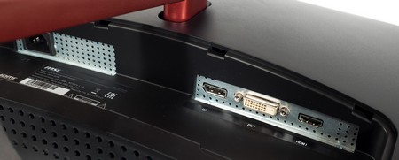 Все порты (DVI-D, DP, HDMI) спрятаны в задней части корпуса за пластиковой накладкой системы прокладки кабелей. Встроенная акустическая система в мониторе отсутствует, а системой управления выступают пять физических клавиш на нижней грани без подсветки.