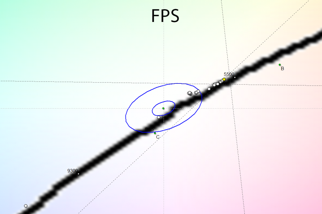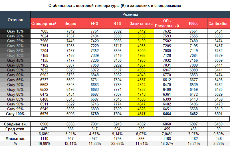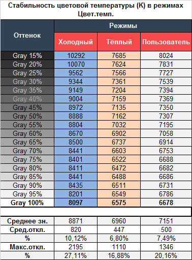 Во всех основных изучаемых режимах монитор продемонстрировал стабильность цветовой температуры оттенков серого на уровне ниже среднего. Максимальные отклонения сильно разняться в зависимости от используемого пресета, да и по среднему разброс почти двукратный, если сравнивать FPS и крайне проблемный RTS.