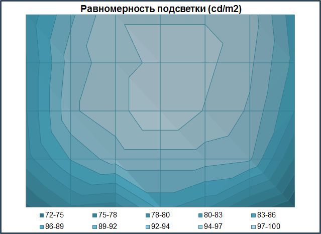 По представленной диаграмме поверхности можно наглядно увидеть, как сосредоточен уровень яркости по полю матрицы. Яркость в 100 нит была выявлена только в центре панели. Больше всего затемнена вся нижняя часть матрицы. Возможно, она сильно пережата в этом месте, но это лишь догадки.
