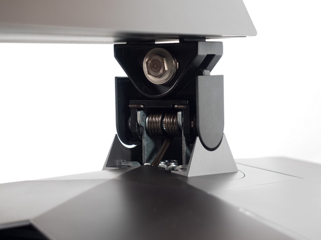 Производитель упростил всё что только можно, но не стал экономить на качестве. G24C обходится без быстросъёмного механизма центральной колонны. Она присоединяется к уже установленному шарниру изменения наклона с помощью двух винтов из комплекта поставки, а закрывается данная область пластиковой накладкой. К самой подставке, в свою очередь, колонна прикрепляется одним предустановленным винтом, без использования отвёртки.