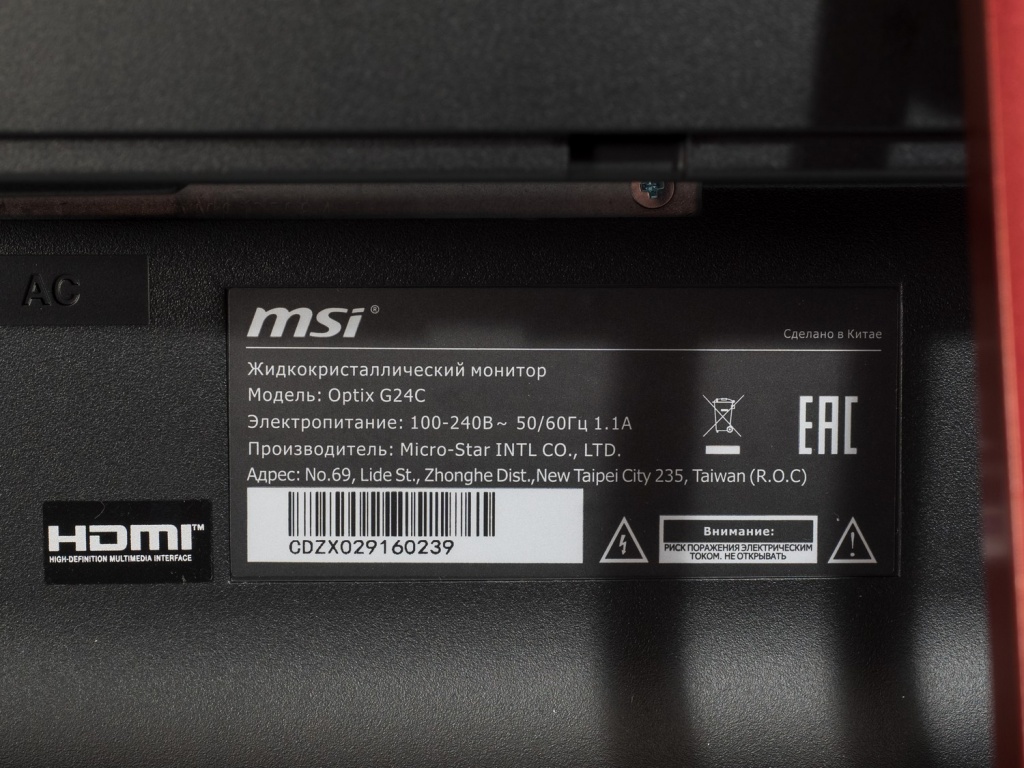 В задней части монитора находится наклейка с информацией, которая повторяет таковую с упаковки монитора. Ничего нового, за исключением, пожалуй, адреса производства(сделано на Тайване)