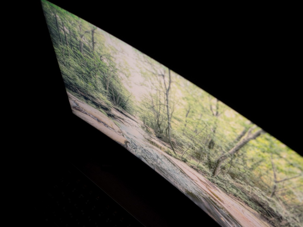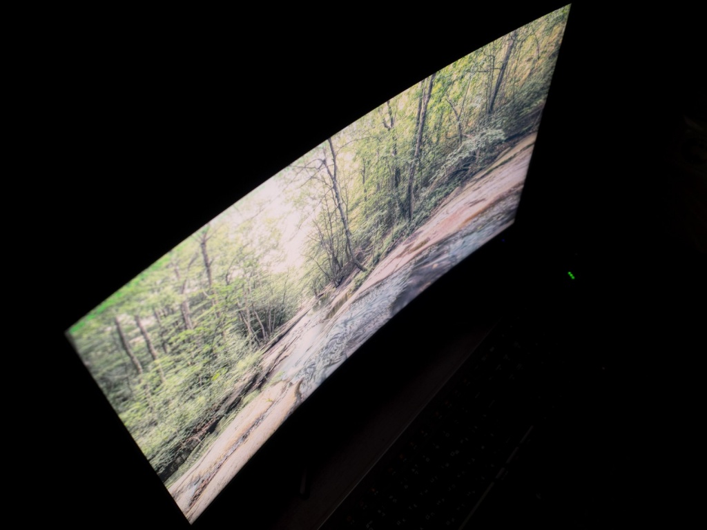 При сильных отклонениях от нормали тени резко становятся более различимыми, насыщенность изображения на экране медленно, но верно снижается, контрастность падает, паразитные оттенки не появляются. При взгляде со стороны картинка на мониторе отдаёт красно-розовым оттенком, что свойственно многим решениям с расширенным цветовым охватом. Проявление Black Crush-эффекта выражено не сильно, по крайней мере значительно слабее, чем на *VA-решениях 2010-2015-годов выпуска.