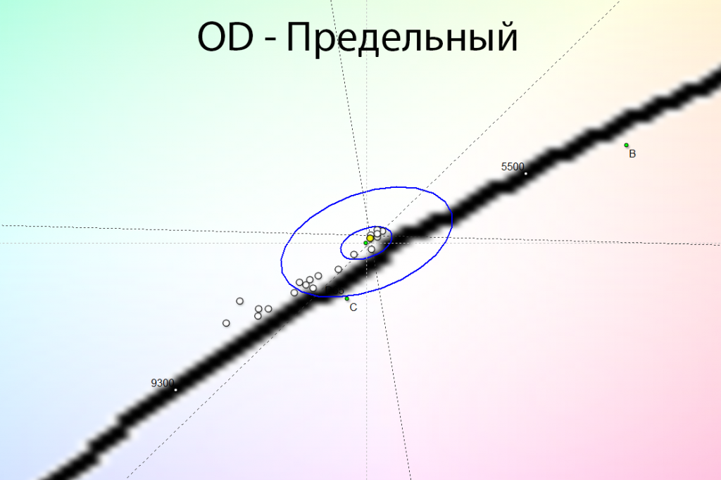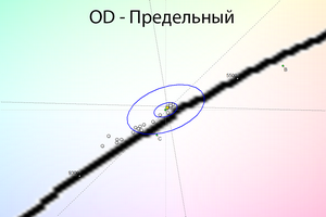 После проведения ручной настройки и калибровки треугольник на CIE диаграмме практически не меняет своё положение, результаты меняются незначительно. Минимальная разница и при включении режимов OD «Нормальный» и «Предельный».